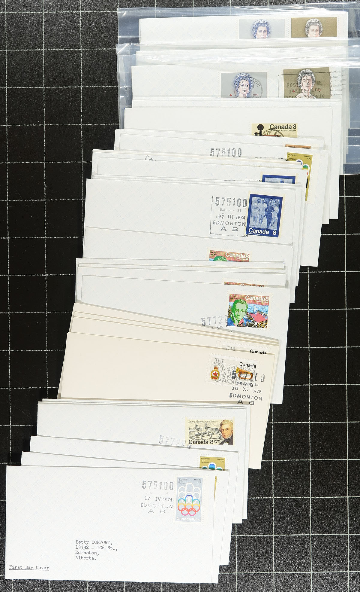 Nice collection of roughly 225 Canada first day covers with Alberta postmarks. The lot contains mostly covers from the 1970's with singles, sets, and a few block frankings, with the overwhelming majority having Edmonton POCON type postmarks from either "575100 SUB-AUX 84" or "577200 SUB-AUX 80", along with a few other postmark types. An interesting lot for the first day cover or Alberta postmark collector. Estimate =