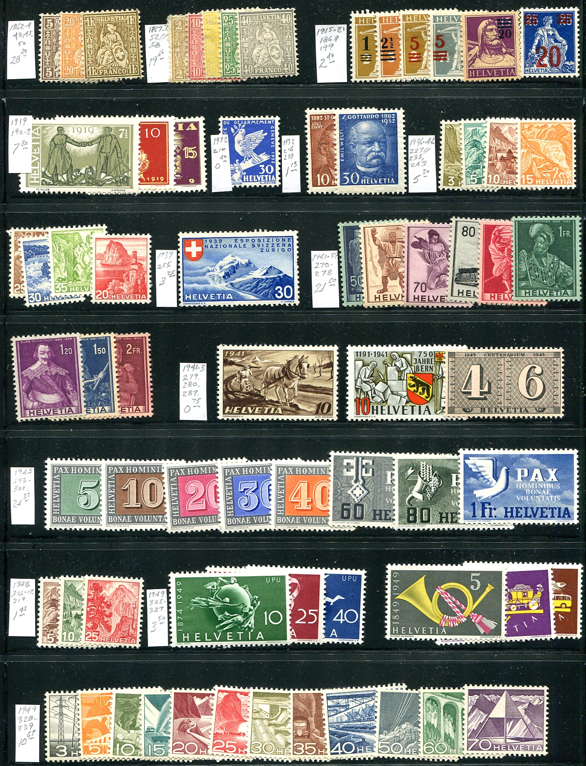 Attractive collection of mint Switzerland, 1867-1960, containing roughly 225 different stamps in a few stock pages. This neatly organized collection begins with a few pre-1900 issues, with the bulk of the material ranging from the 1930's to the 1950's, including a few semi-postal and other back of the book material. Each stamp or set has been identified and catalogued noting a few items ranging $10 to $30 and up. A nicely organized collection of this popular area of philately. 2025 Scott US$541.00 =