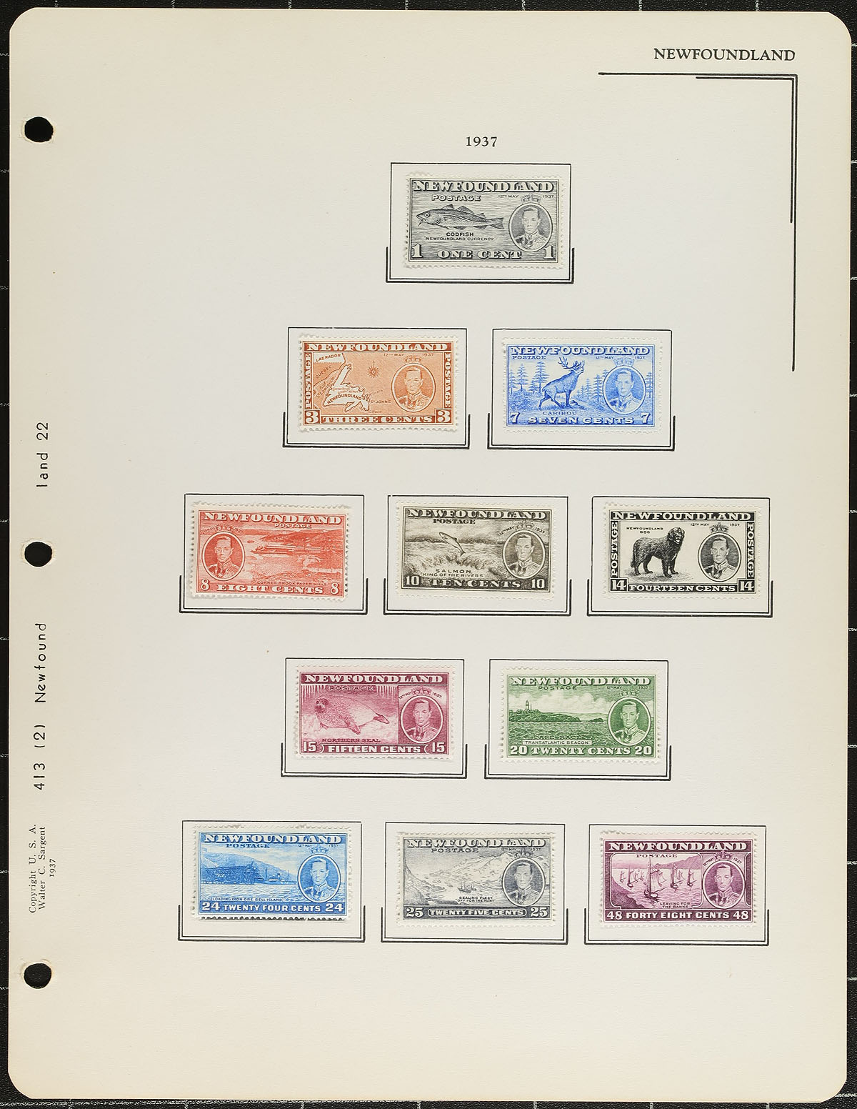 Complete mint collection of 1937 Omnibus Coronation issues, including non-common designs in a Sargent Collector's Album. The lot contains 187 stamps (all sets), all mint hinged on pages with a current catalogue value totaling US$166.00 ($224.10 CDN). A nice clean lot in a specialized album for these issues. Estimate =