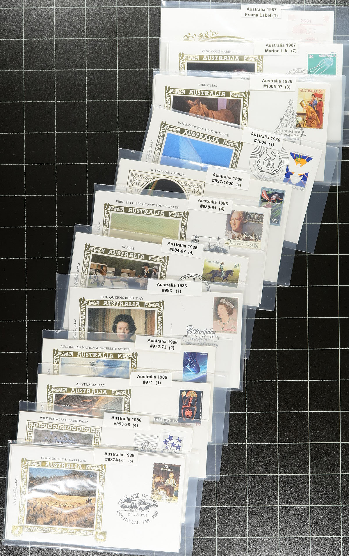 Group of roughly 300 Australia first day covers, 1980's-2000's, containing single and set franking, all individually sleeved and identified by Scott number. The lot includes 194 Benham first day covers with silk cachets, with all covers being unaddressed. A high retailing lot that should appeal to collectors and dealers alike. Estimate =