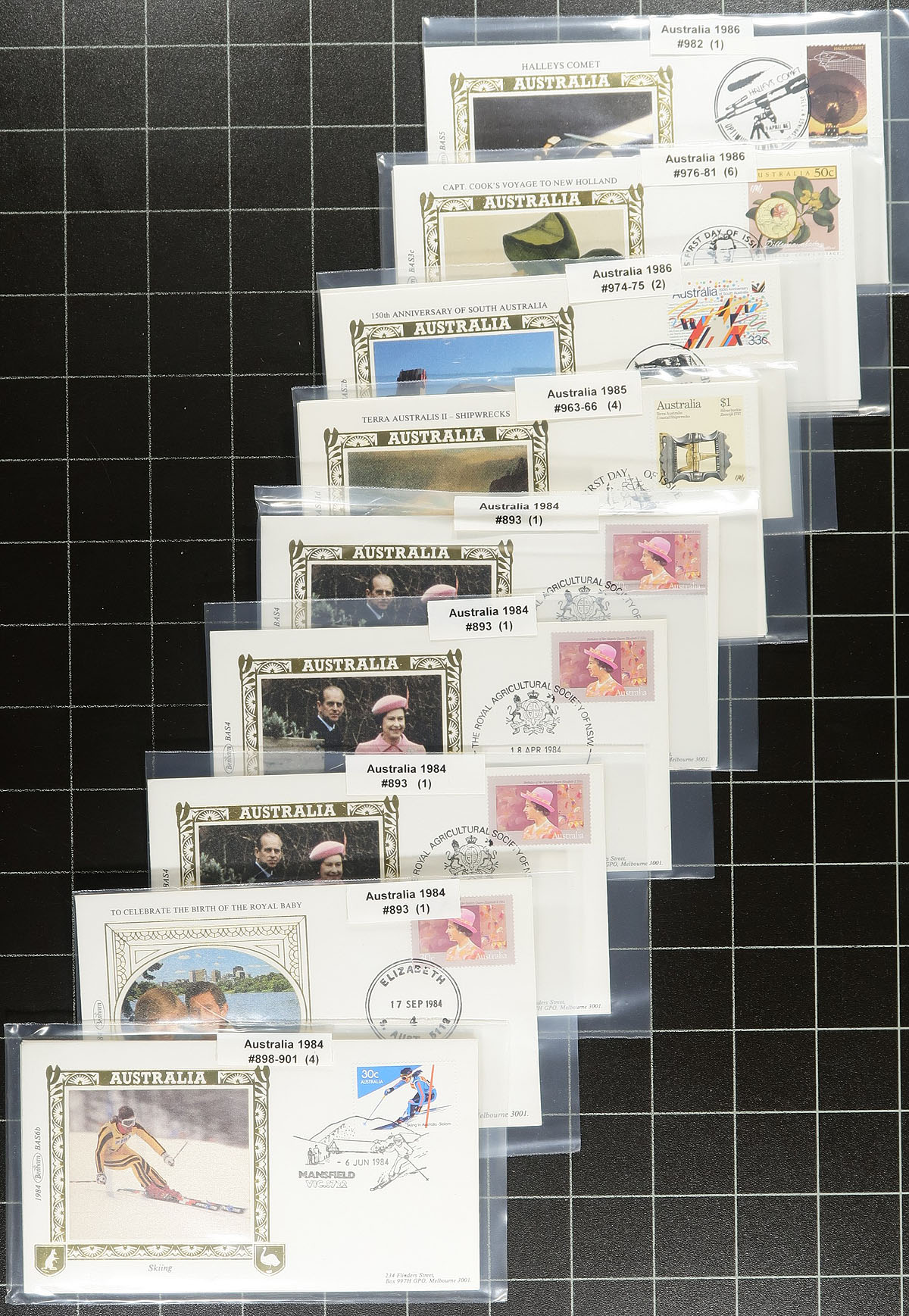 Group of roughly 300 Australia first day covers, 1980's-2000's, containing single and set franking, all individually sleeved and identified by Scott number. The lot includes 194 Benham first day covers with silk cachets, with all covers being unaddressed. A high retailing lot that should appeal to collectors and dealers alike. Estimate =