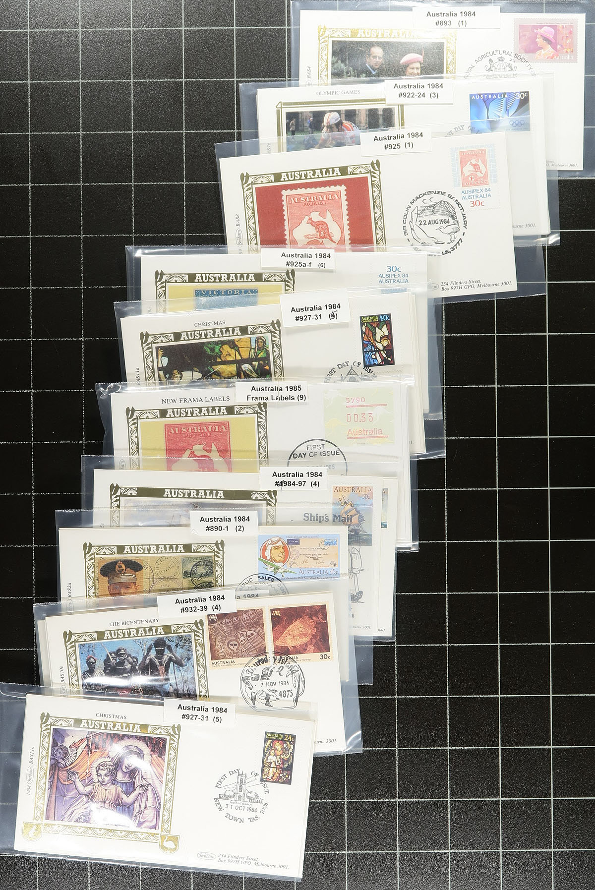 Group of roughly 300 Australia first day covers, 1980's-2000's, containing single and set franking, all individually sleeved and identified by Scott number. The lot includes 194 Benham first day covers with silk cachets, with all covers being unaddressed. A high retailing lot that should appeal to collectors and dealers alike. Estimate =