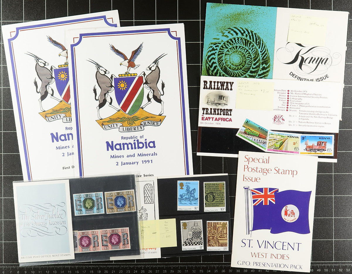 Carton full of thematic collections, mostly stamp sets and covers from Commonwealth countries including: two first day cover albums from the Australian First Day Cover Society (roughly 100 covers in total), Stanley Gibbons Royal Wedding Stamp Album, The Commonwealth Collection of Silver Jubilee First Day covers, New Zealand presentation packs, year sets, and more. A nice lot for the thematic and topical collector. Estimate =