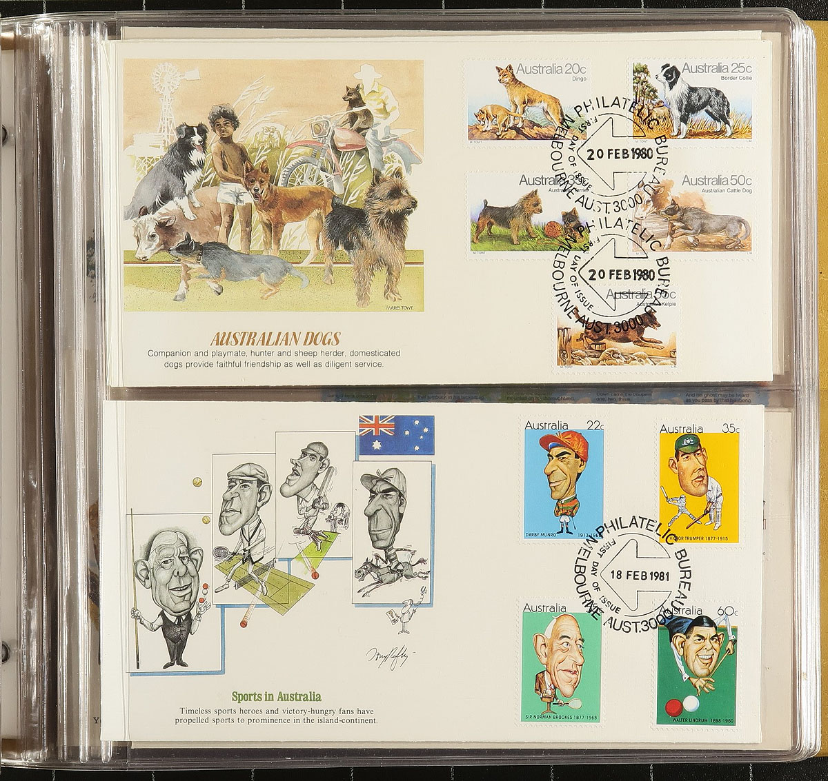 Carton full of thematic collections, mostly stamp sets and covers from Commonwealth countries including: two first day cover albums from the Australian First Day Cover Society (roughly 100 covers in total), Stanley Gibbons Royal Wedding Stamp Album, The Commonwealth Collection of Silver Jubilee First Day covers, New Zealand presentation packs, year sets, and more. A nice lot for the thematic and topical collector. Estimate =