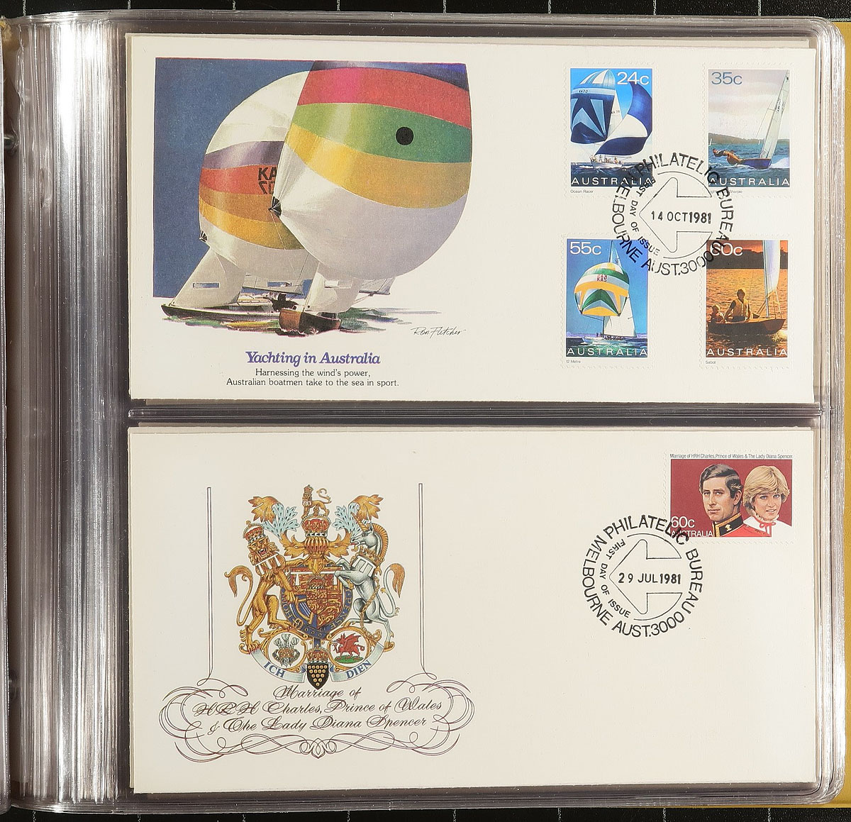 Carton full of thematic collections, mostly stamp sets and covers from Commonwealth countries including: two first day cover albums from the Australian First Day Cover Society (roughly 100 covers in total), Stanley Gibbons Royal Wedding Stamp Album, The Commonwealth Collection of Silver Jubilee First Day covers, New Zealand presentation packs, year sets, and more. A nice lot for the thematic and topical collector. Estimate =