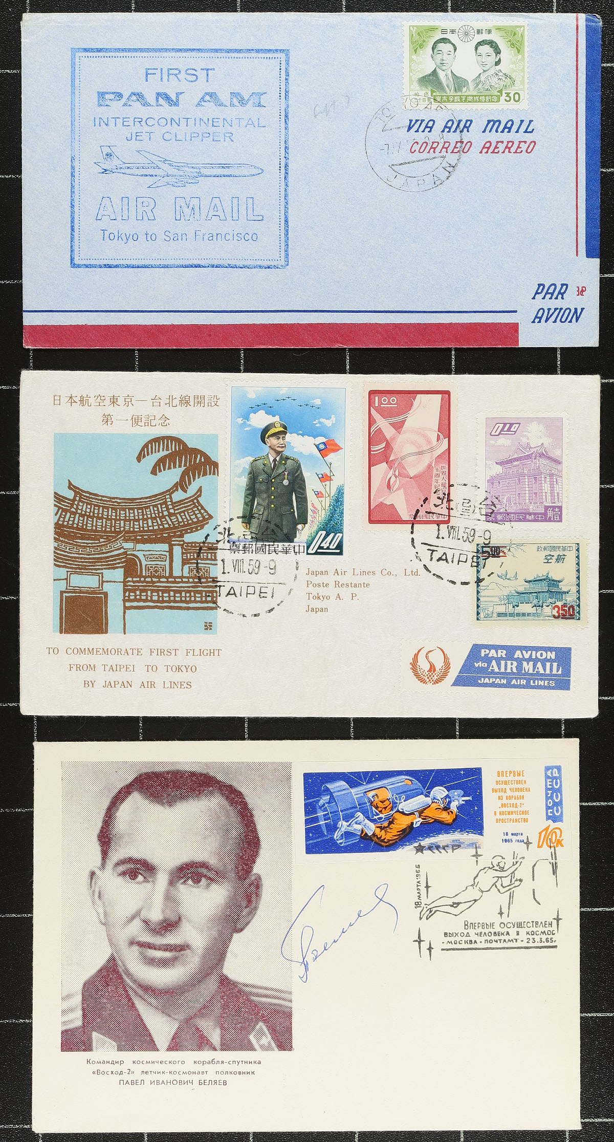 Group of roughly 135 worldwide flight covers, 1940's-1980's, including first flights from PAN AM, Air Canada, BOAC, Qantas, and more, commemorative flights, anniversary flights, for several worldwide routes, noting either airmail stamps, cachets, or handstamps. The lot also includes a few space related covers, a few of them signed by Russian space crews. Majority of the material appears to be Air Canada or Qantas first flights, but has a worldwide flavour to the lot. Overall fine to very fine and well worth our reasonable estimate of less than $1.00 per cover. Estimate =