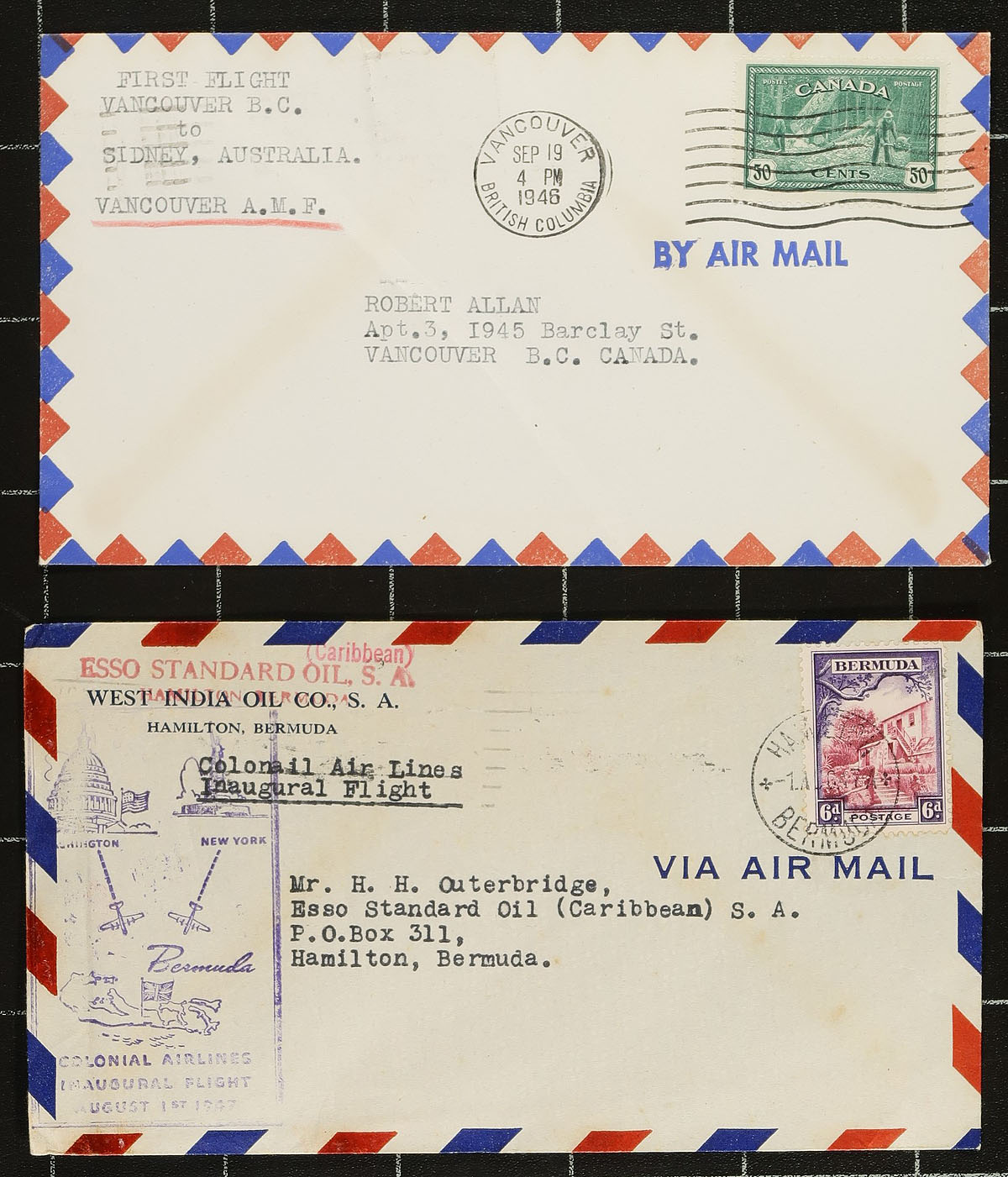 Group of roughly 135 worldwide flight covers, 1940's-1980's, including first flights from PAN AM, Air Canada, BOAC, Qantas, and more, commemorative flights, anniversary flights, for several worldwide routes, noting either airmail stamps, cachets, or handstamps. The lot also includes a few space related covers, a few of them signed by Russian space crews. Majority of the material appears to be Air Canada or Qantas first flights, but has a worldwide flavour to the lot. Overall fine to very fine and well worth our reasonable estimate of less than $1.00 per cover. Estimate =