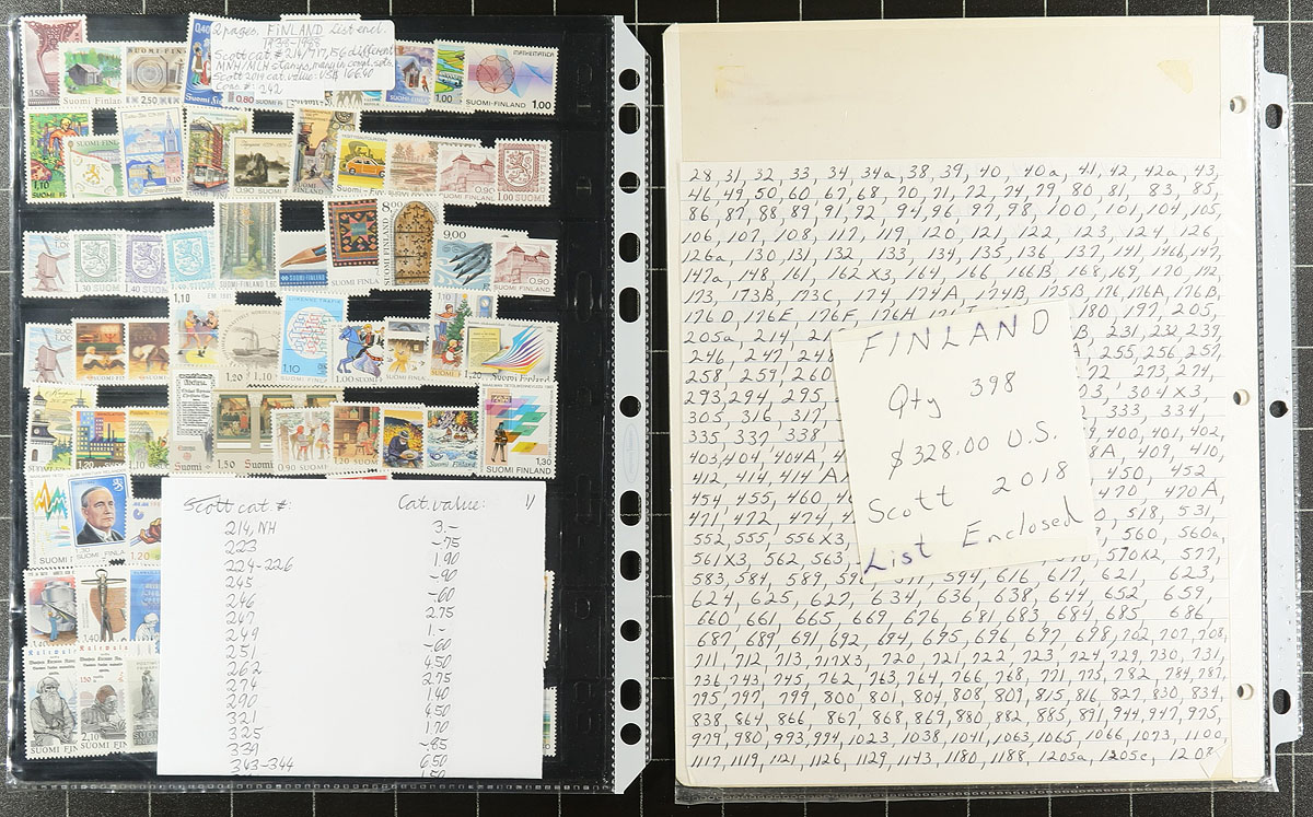 Collection of mint and used Finland, 1900-2011, containing just over 1,000 stamps in roughly 20 album or stock pages. The collection is an even mix of mint and used material, generally ranging from Scott #28/1370, with used material throughout and mint material concentrated from the 1970's to the 1990's. A spot check indicated some material cataloguing in the $5 to $10 range. Owner's 2019 Scott catalogue value for the lot totals US$1,021.00 ($1378.25 CDN). Some mild duplication possible, still a nice lot of this popular collecting country. Estimate =