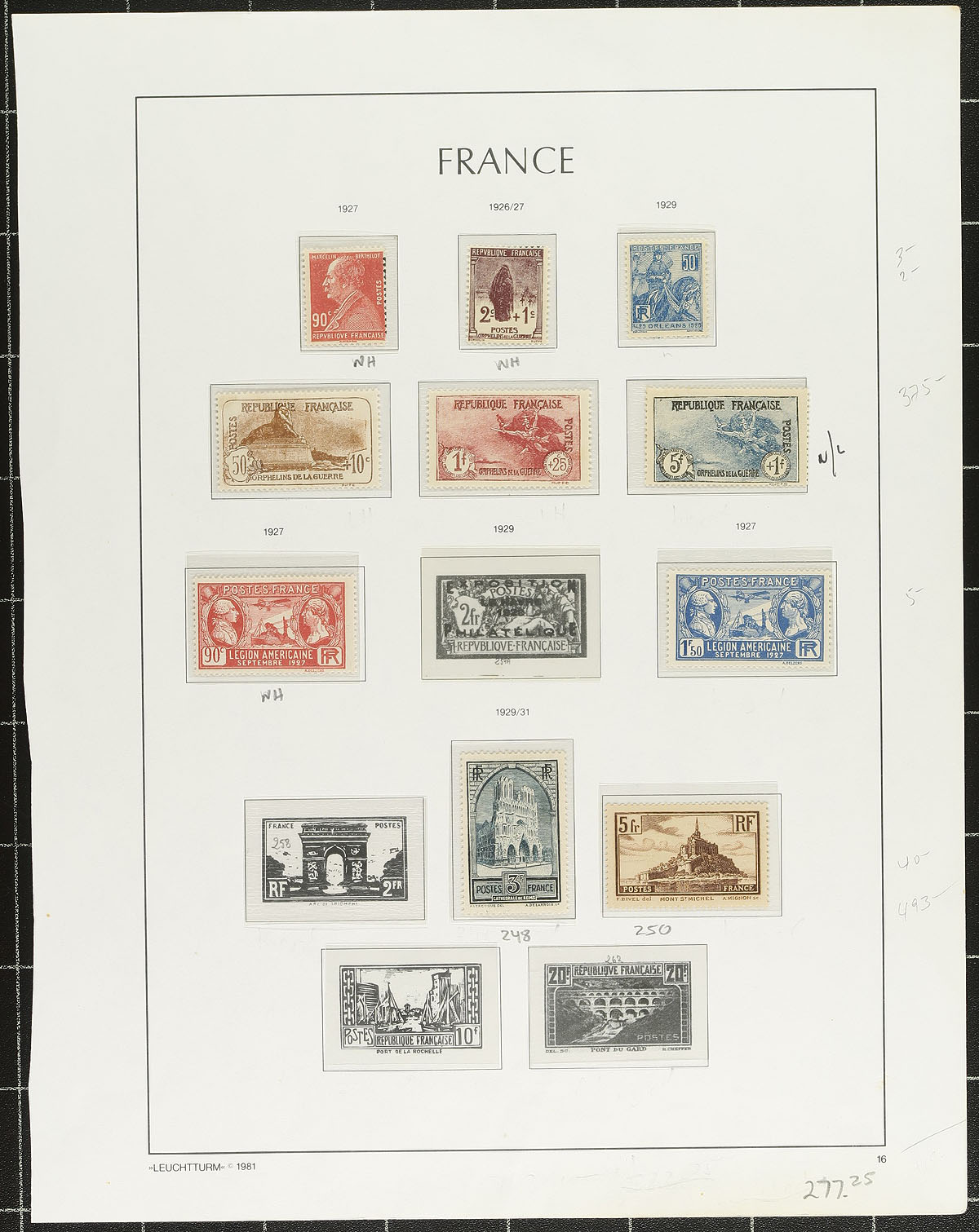 Collection of mint France, 1926-1993, containing roughly 700 stamps in roughly 15 album or stock pages. The collection generally ranges from Scott #229/2343, with the majority of material from the 1940s to the 1980s, along with a few semi-postals, including Scott #s 248 (mh, c.v. $60), 348 (nh, $150), along with a few stamps and sets ranging from $5 to $20 and up each. Owner's 2019 Scott catalogue for the collection totals US$1,251.00 ($1688.85 CDN). A spot check indicated a mixture of mint hinged and never hinged material. A nice lot of this popular area of philately. Estimate =