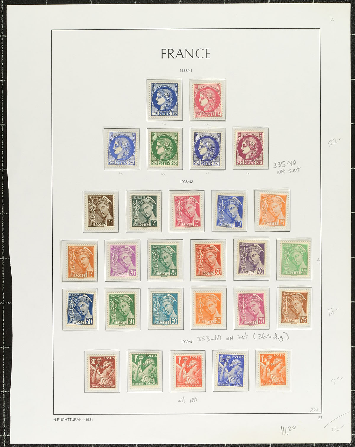 Collection of mint France, 1926-1993, containing roughly 700 stamps in roughly 15 album or stock pages. The collection generally ranges from Scott #229/2343, with the majority of material from the 1940s to the 1980s, along with a few semi-postals, including Scott #s 248 (mh, c.v. $60), 348 (nh, $150), along with a few stamps and sets ranging from $5 to $20 and up each. Owner's 2019 Scott catalogue for the collection totals US$1,251.00 ($1688.85 CDN). A spot check indicated a mixture of mint hinged and never hinged material. A nice lot of this popular area of philately. Estimate =