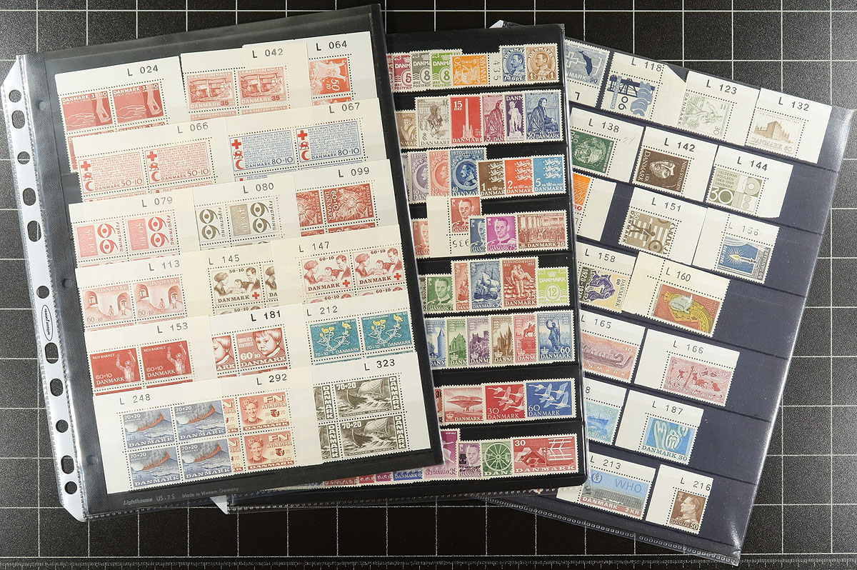 Nice grouping of mint Denmark, 1918-1980, containing roughly 400 stamps, including a few plate blocks, in 7 stock pages. The lot is generally well organized ranging from Scott #151/571, including 28 plate blocks ranging from B30/B58. The lot also including a small group of mint corner singles with plate numbers in the selvedge. Owner's 2019 Scott catalogue value for the lot totals US$508.00 ($685.80 CDN). A few faults with a few of the early issues, overall a nice lot for the Denmark collector. Estimate =