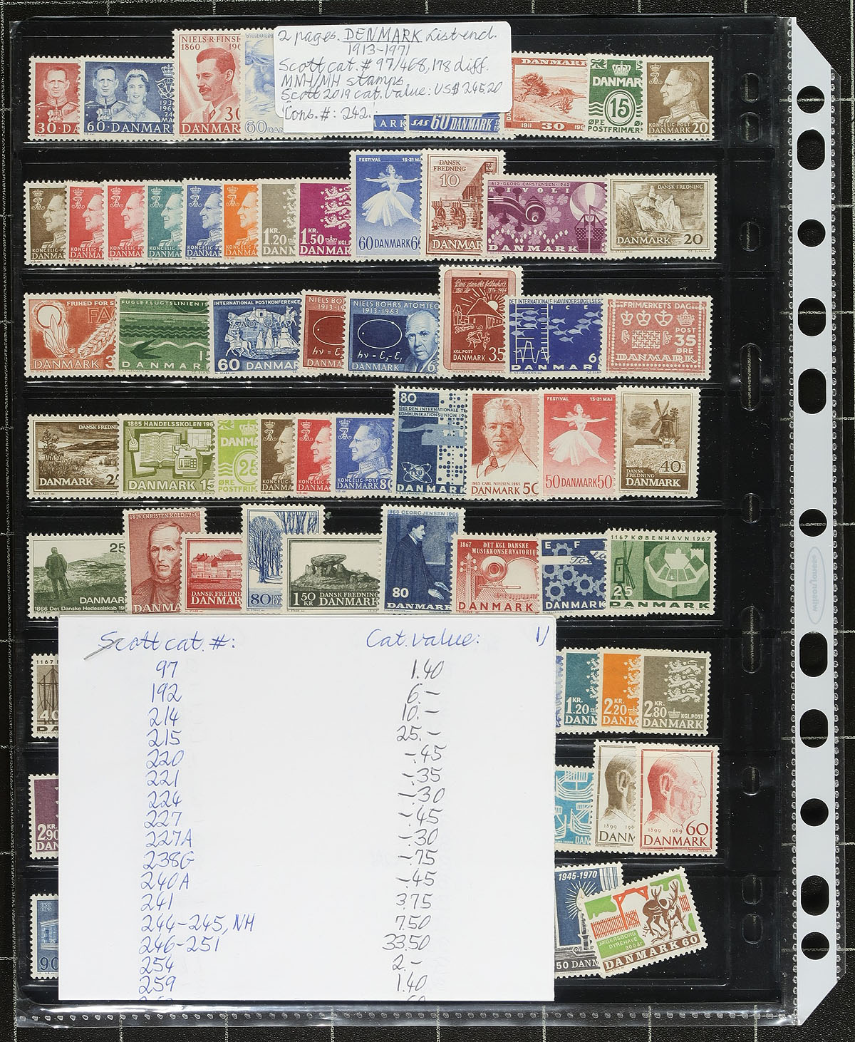 Nice grouping of mint Denmark, 1918-1980, containing roughly 400 stamps, including a few plate blocks, in 7 stock pages. The lot is generally well organized ranging from Scott #151/571, including 28 plate blocks ranging from B30/B58. The lot also including a small group of mint corner singles with plate numbers in the selvedge. Owner's 2019 Scott catalogue value for the lot totals US$508.00 ($685.80 CDN). A few faults with a few of the early issues, overall a nice lot for the Denmark collector. Estimate =