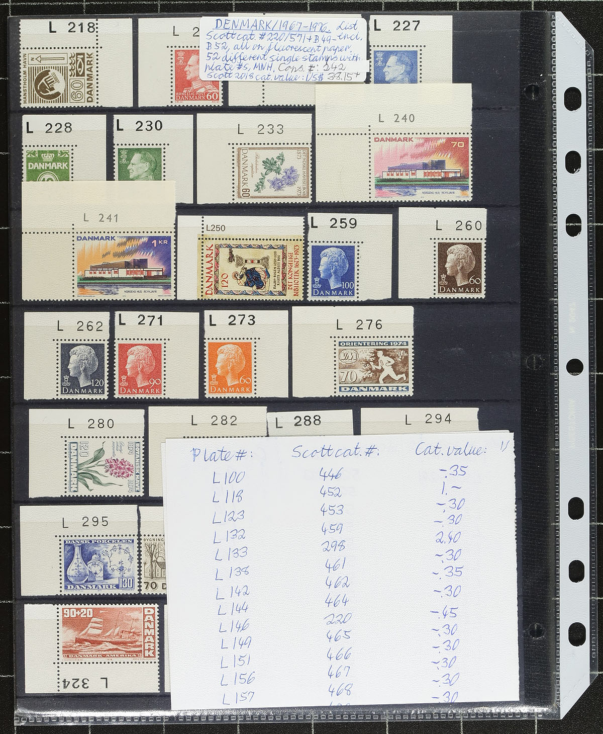 Nice grouping of mint Denmark, 1918-1980, containing roughly 400 stamps, including a few plate blocks, in 7 stock pages. The lot is generally well organized ranging from Scott #151/571, including 28 plate blocks ranging from B30/B58. The lot also including a small group of mint corner singles with plate numbers in the selvedge. Owner's 2019 Scott catalogue value for the lot totals US$508.00 ($685.80 CDN). A few faults with a few of the early issues, overall a nice lot for the Denmark collector. Estimate =