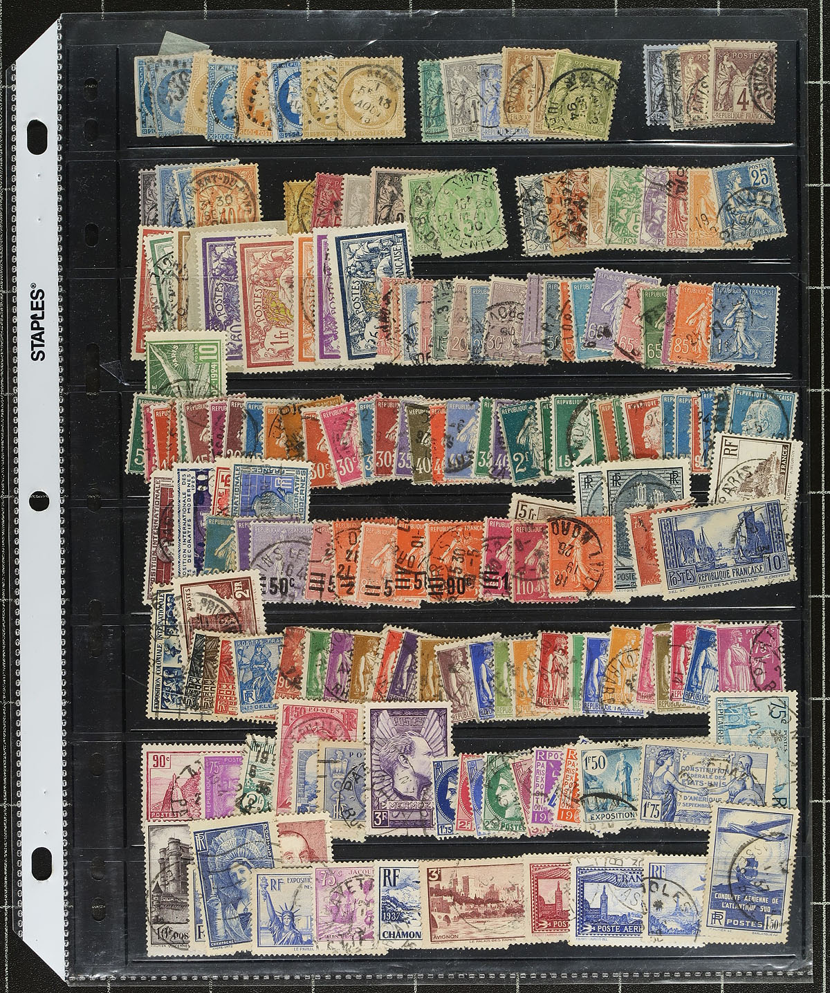 Accumulation of classic used France, 1860's-1940, containing roughly 650 stamps on 4 stock pages and several homemade pages. This fairly organized collection generally ranges from Scott #15/346, along with back of the book issues, with some stamps cataloguing $5 to $10 each. Postmark interest includes numeral, cds, double rings, and other postmark types, including several "socked on the nose" town cancels. Owner's 2019 catalogue value for the lot totals US$1,140.00 ($1539.00 CDN). Duplication up to 5 for some issues, still a nice lot for the postmark collector. Estimate =