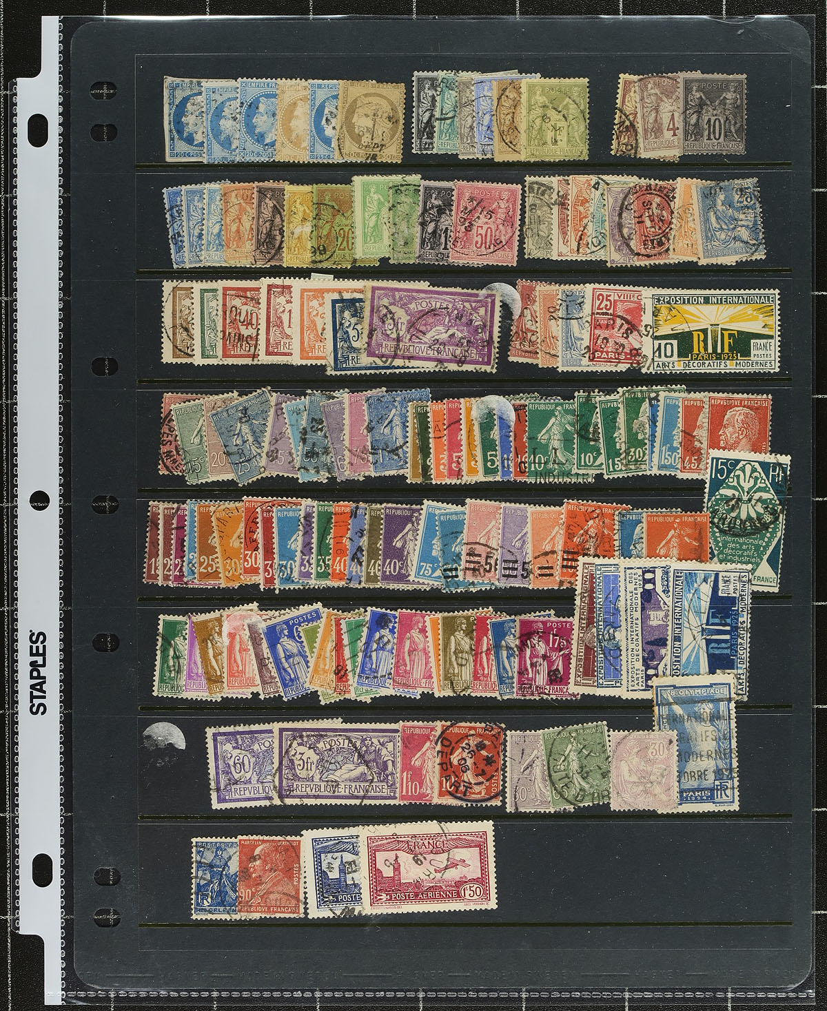 Accumulation of classic used France, 1860's-1940, containing roughly 650 stamps on 4 stock pages and several homemade pages. This fairly organized collection generally ranges from Scott #15/346, along with back of the book issues, with some stamps cataloguing $5 to $10 each. Postmark interest includes numeral, cds, double rings, and other postmark types, including several "socked on the nose" town cancels. Owner's 2019 catalogue value for the lot totals US$1,140.00 ($1539.00 CDN). Duplication up to 5 for some issues, still a nice lot for the postmark collector. Estimate =