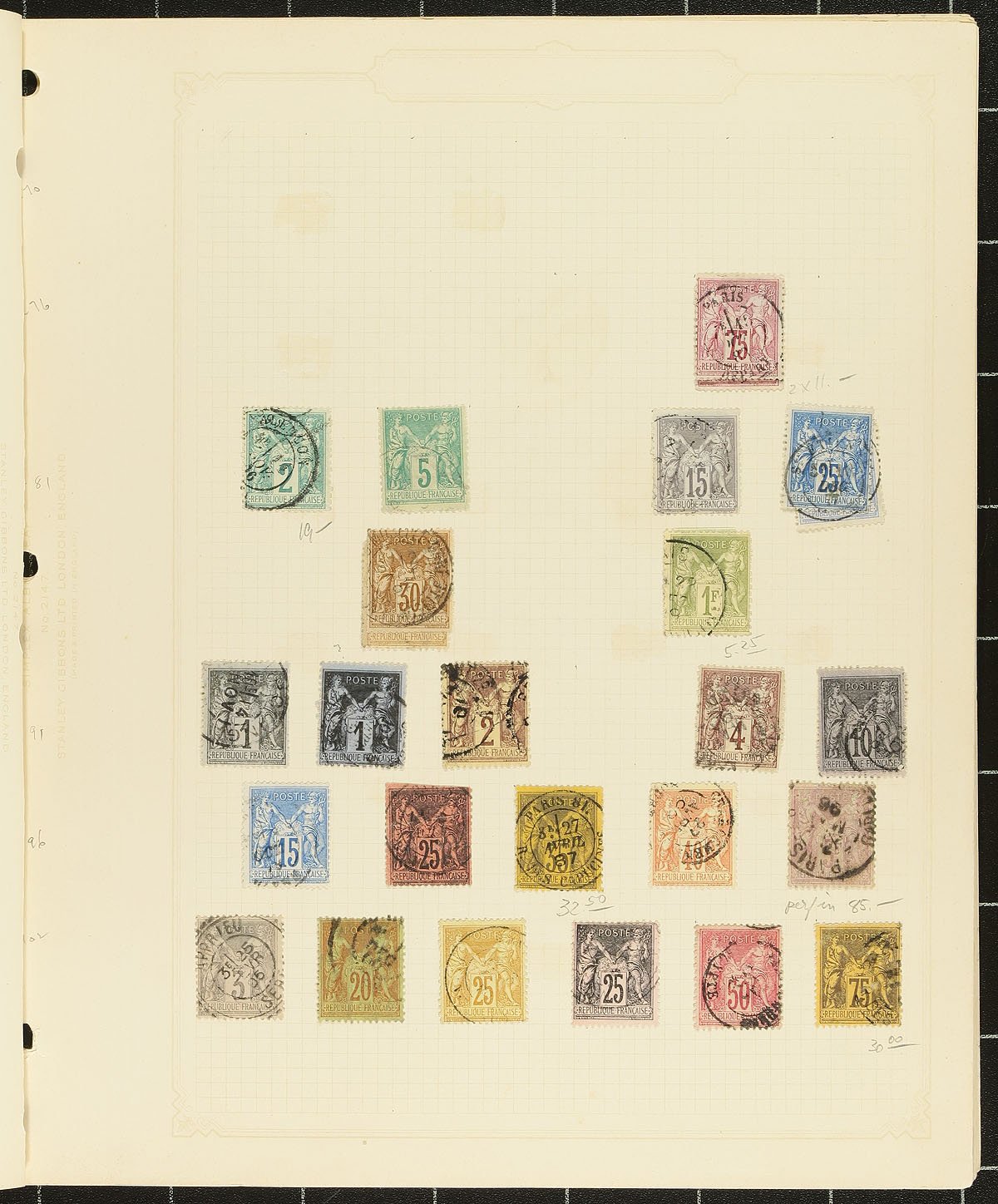 Accumulation of classic used France, 1860's-1940, containing roughly 650 stamps on 4 stock pages and several homemade pages. This fairly organized collection generally ranges from Scott #15/346, along with back of the book issues, with some stamps cataloguing $5 to $10 each. Postmark interest includes numeral, cds, double rings, and other postmark types, including several "socked on the nose" town cancels. Owner's 2019 catalogue value for the lot totals US$1,140.00 ($1539.00 CDN). Duplication up to 5 for some issues, still a nice lot for the postmark collector. Estimate =