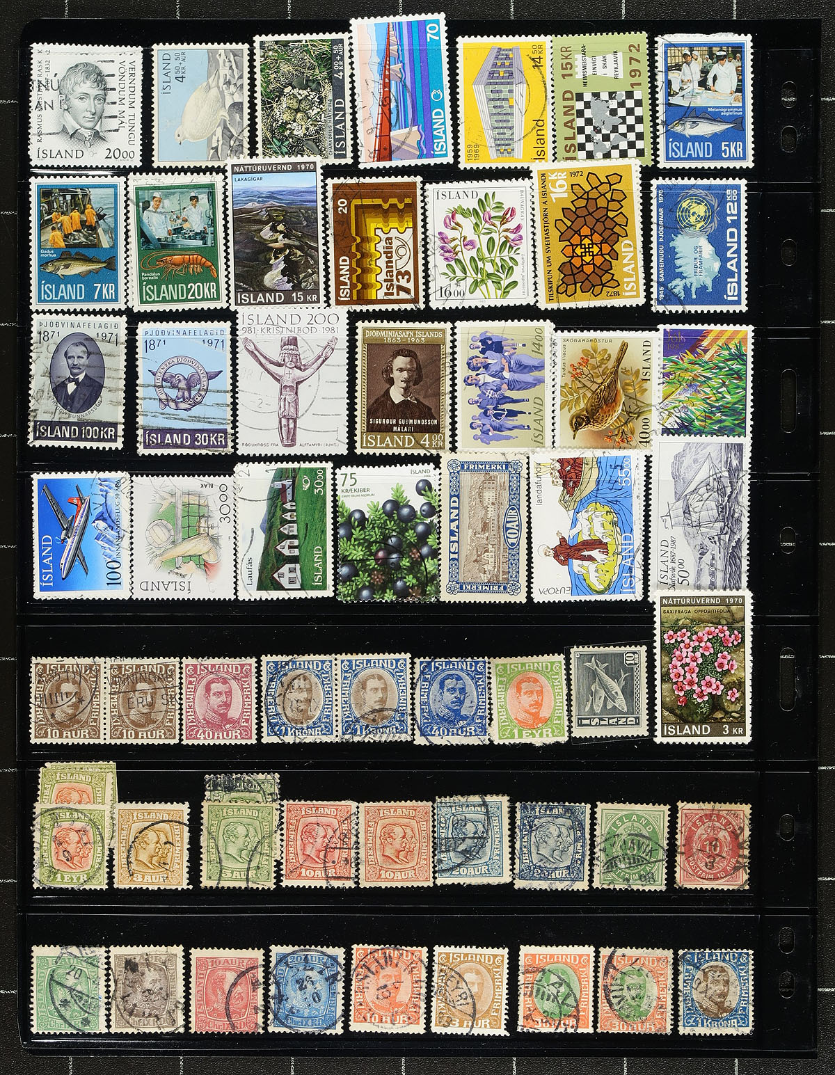 Collection / accumulation of primarily used Iceland, 1902-2007, containing well over 1,000 stamps on roughly 40 stock pages. We note a wide variety of stamps here with classic singles, along with some modern used, along with back of the book issues. A cursory check of the collection indicates some stamps, sets, and partial sets cataloguing in the $5 to $15 range and up. Postmark interest includes a few numerals and cds types, including a few smaller towns. A potentially high cataloguing lot, and a popular collecting area with possible finds for the specialist. Estimate =