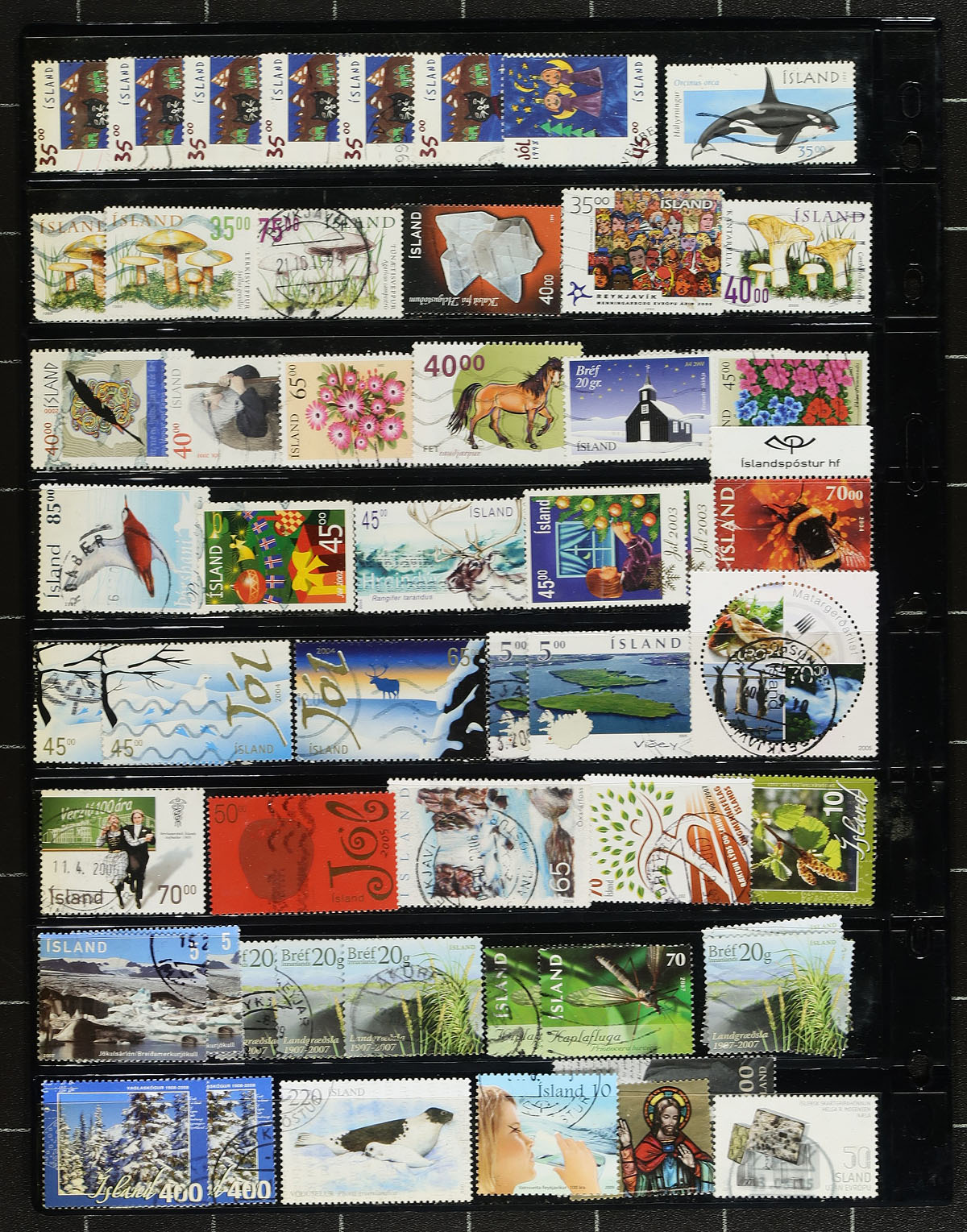 Collection / accumulation of primarily used Iceland, 1902-2007, containing well over 1,000 stamps on roughly 40 stock pages. We note a wide variety of stamps here with classic singles, along with some modern used, along with back of the book issues. A cursory check of the collection indicates some stamps, sets, and partial sets cataloguing in the $5 to $15 range and up. Postmark interest includes a few numerals and cds types, including a few smaller towns. A potentially high cataloguing lot, and a popular collecting area with possible finds for the specialist. Estimate =