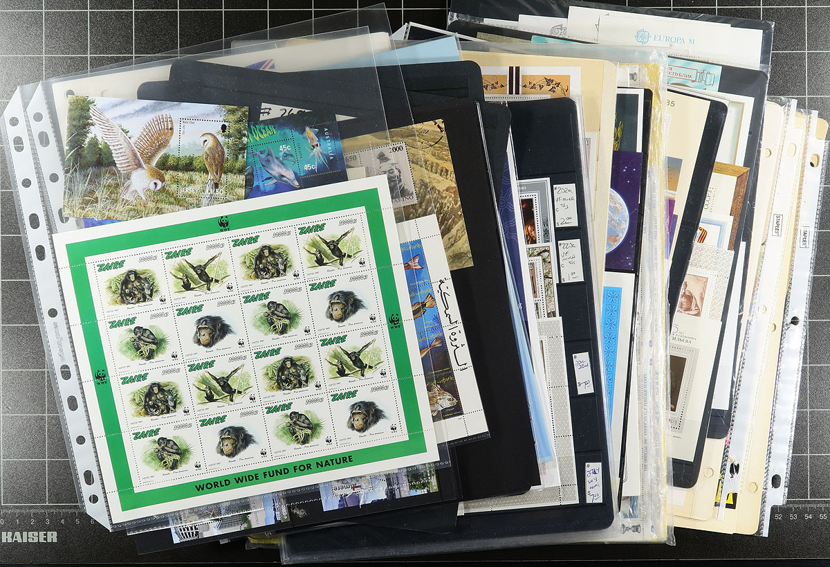 Very nice group of roughly 270 worldwide souvenir sheets. The material generally ranges from the 1970's to the 1990's, primarily never hinged, with a few receiving CTO cancel, with the majority in stock pages. We note better representation from New Zealand, Niue, Portugal, and other British Commonwealth countries, and encountered several suitable topical and thematic subject including: Christmas, Europa, sports, birds, royalty and more. A clean lot for collectors and dealers alike. Estimate =