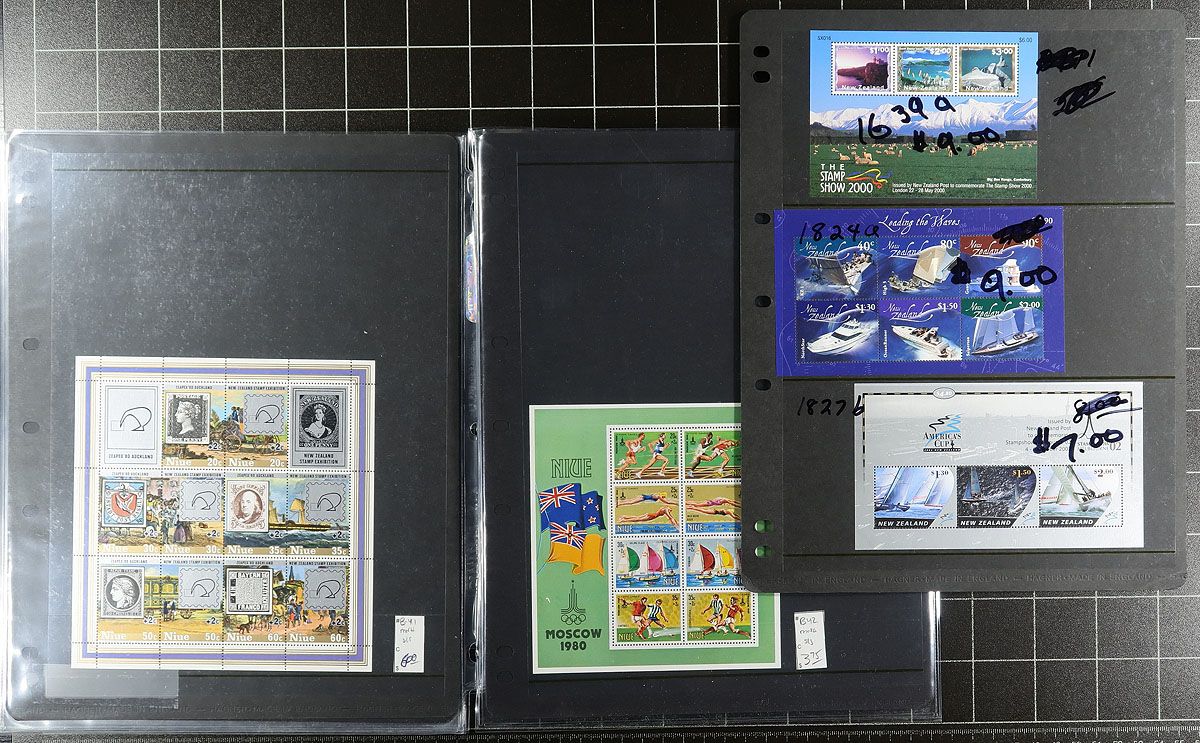 Very nice group of roughly 270 worldwide souvenir sheets. The material generally ranges from the 1970's to the 1990's, primarily never hinged, with a few receiving CTO cancel, with the majority in stock pages. We note better representation from New Zealand, Niue, Portugal, and other British Commonwealth countries, and encountered several suitable topical and thematic subject including: Christmas, Europa, sports, birds, royalty and more. A clean lot for collectors and dealers alike. Estimate =