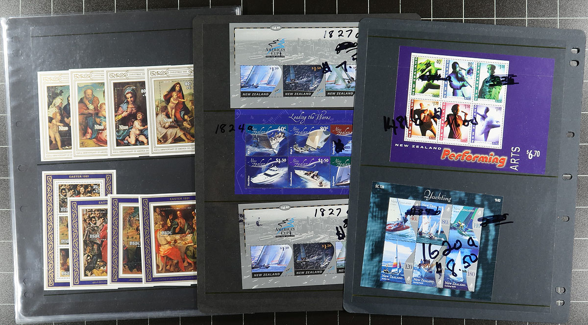 Very nice group of roughly 270 worldwide souvenir sheets. The material generally ranges from the 1970's to the 1990's, primarily never hinged, with a few receiving CTO cancel, with the majority in stock pages. We note better representation from New Zealand, Niue, Portugal, and other British Commonwealth countries, and encountered several suitable topical and thematic subject including: Christmas, Europa, sports, birds, royalty and more. A clean lot for collectors and dealers alike. Estimate =