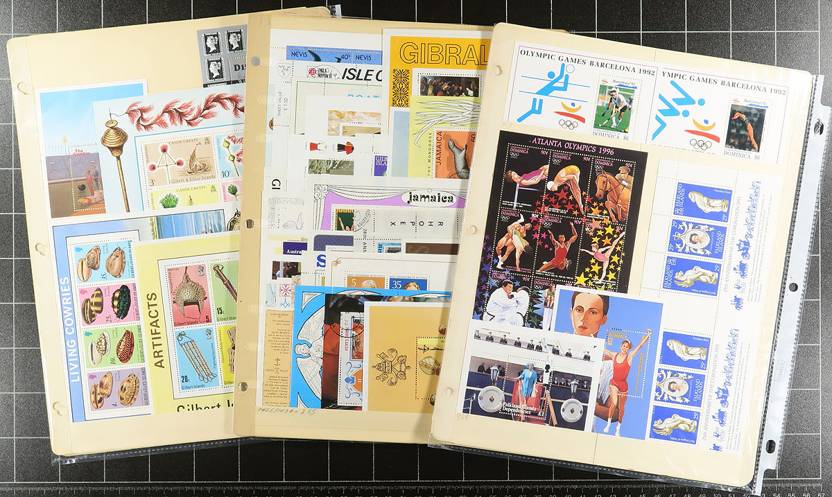 Very nice group of roughly 270 worldwide souvenir sheets. The material generally ranges from the 1970's to the 1990's, primarily never hinged, with a few receiving CTO cancel, with the majority in stock pages. We note better representation from New Zealand, Niue, Portugal, and other British Commonwealth countries, and encountered several suitable topical and thematic subject including: Christmas, Europa, sports, birds, royalty and more. A clean lot for collectors and dealers alike. Estimate =