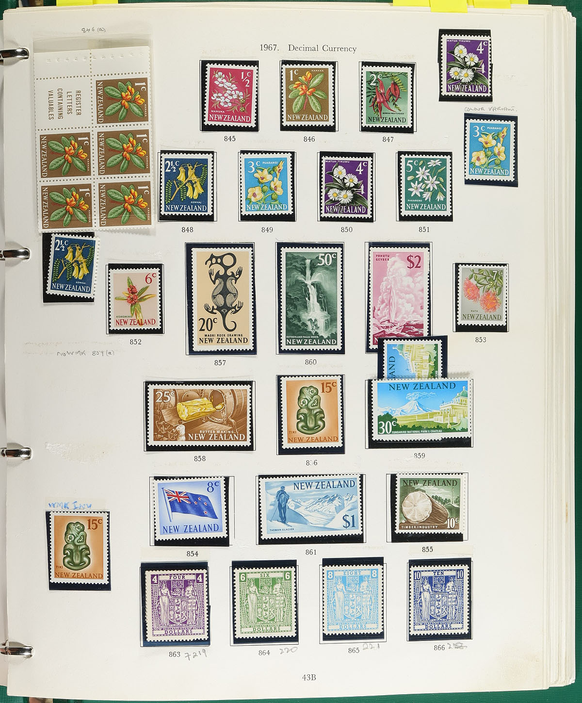 Lovely collection of primarily never hinged New Zealand in a Stanley Gibbons album, 1967-1987, containing roughly 650 stamp, neatly organized in hingeless mounts. The collection ranges from Scott #382/886, along with Health singles and sheets ranging from #B73/B129, along with a few back of the book issues. We estimate the collection to be 90% complete in period, along with a few identified watermark and perforation varieties. We noted some singles, sets, and souvenir sheets cataloguing $10 to $15 and up, with at least a few hundred dollars of face value postage alone. 2025 Scott US$741.00 =