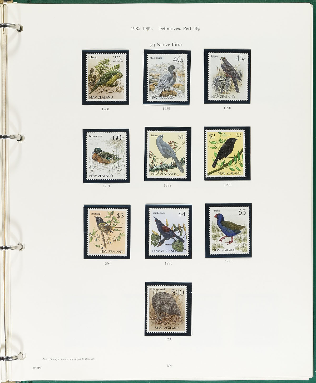 Lovely collection of primarily never hinged New Zealand in a Stanley Gibbons album, 1967-1987, containing roughly 650 stamp, neatly organized in hingeless mounts. The collection ranges from Scott #382/886, along with Health singles and sheets ranging from #B73/B129, along with a few back of the book issues. We estimate the collection to be 90% complete in period, along with a few identified watermark and perforation varieties. We noted some singles, sets, and souvenir sheets cataloguing $10 to $15 and up, with at least a few hundred dollars of face value postage alone. 2025 Scott US$741.00 =