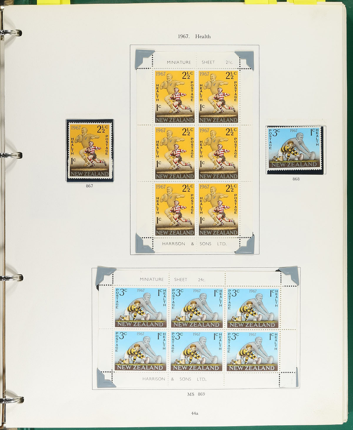 Lovely collection of primarily never hinged New Zealand in a Stanley Gibbons album, 1967-1987, containing roughly 650 stamp, neatly organized in hingeless mounts. The collection ranges from Scott #382/886, along with Health singles and sheets ranging from #B73/B129, along with a few back of the book issues. We estimate the collection to be 90% complete in period, along with a few identified watermark and perforation varieties. We noted some singles, sets, and souvenir sheets cataloguing $10 to $15 and up, with at least a few hundred dollars of face value postage alone. 2025 Scott US$741.00 =