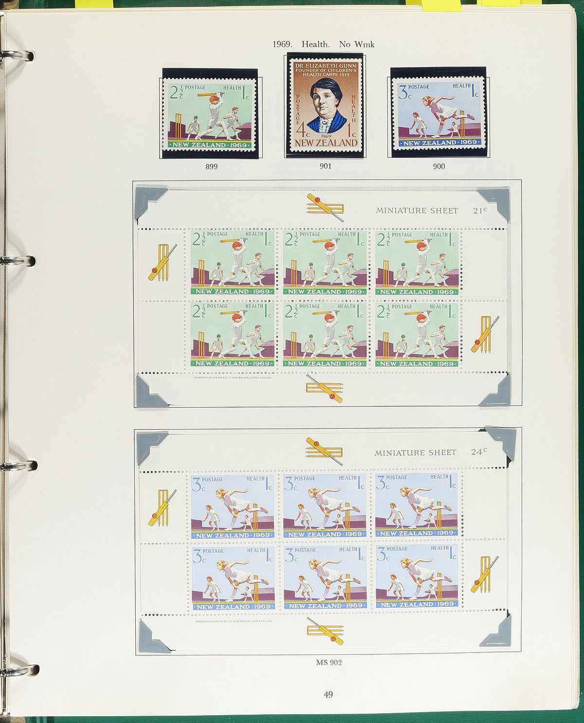 Lovely collection of primarily never hinged New Zealand in a Stanley Gibbons album, 1967-1987, containing roughly 650 stamp, neatly organized in hingeless mounts. The collection ranges from Scott #382/886, along with Health singles and sheets ranging from #B73/B129, along with a few back of the book issues. We estimate the collection to be 90% complete in period, along with a few identified watermark and perforation varieties. We noted some singles, sets, and souvenir sheets cataloguing $10 to $15 and up, with at least a few hundred dollars of face value postage alone. 2025 Scott US$741.00 =