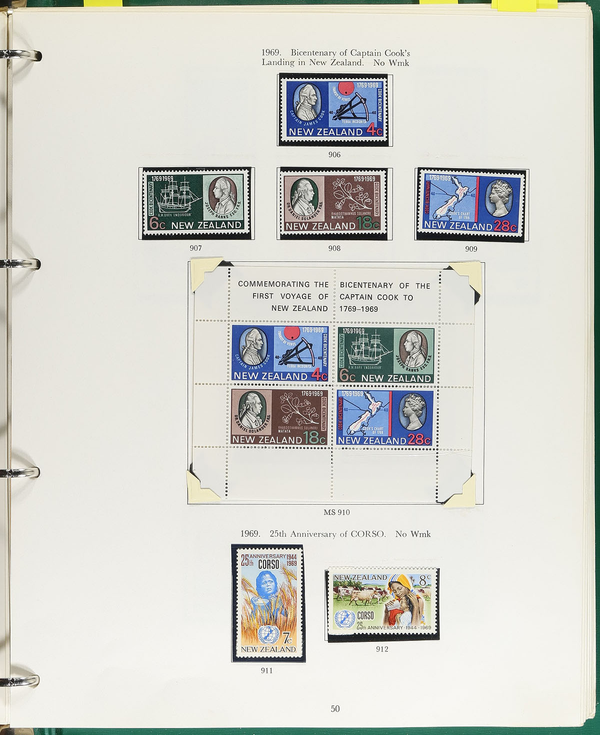 Lovely collection of primarily never hinged New Zealand in a Stanley Gibbons album, 1967-1987, containing roughly 650 stamp, neatly organized in hingeless mounts. The collection ranges from Scott #382/886, along with Health singles and sheets ranging from #B73/B129, along with a few back of the book issues. We estimate the collection to be 90% complete in period, along with a few identified watermark and perforation varieties. We noted some singles, sets, and souvenir sheets cataloguing $10 to $15 and up, with at least a few hundred dollars of face value postage alone. 2025 Scott US$741.00 =