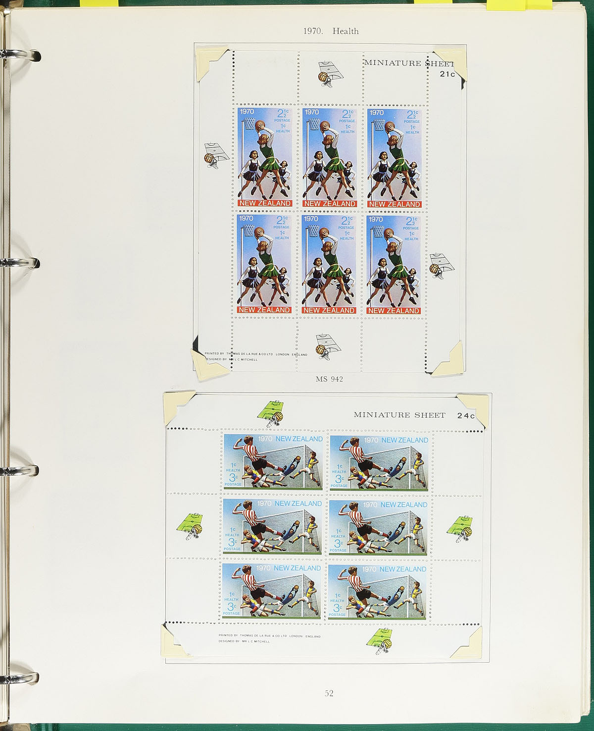 Lovely collection of primarily never hinged New Zealand in a Stanley Gibbons album, 1967-1987, containing roughly 650 stamp, neatly organized in hingeless mounts. The collection ranges from Scott #382/886, along with Health singles and sheets ranging from #B73/B129, along with a few back of the book issues. We estimate the collection to be 90% complete in period, along with a few identified watermark and perforation varieties. We noted some singles, sets, and souvenir sheets cataloguing $10 to $15 and up, with at least a few hundred dollars of face value postage alone. 2025 Scott US$741.00 =