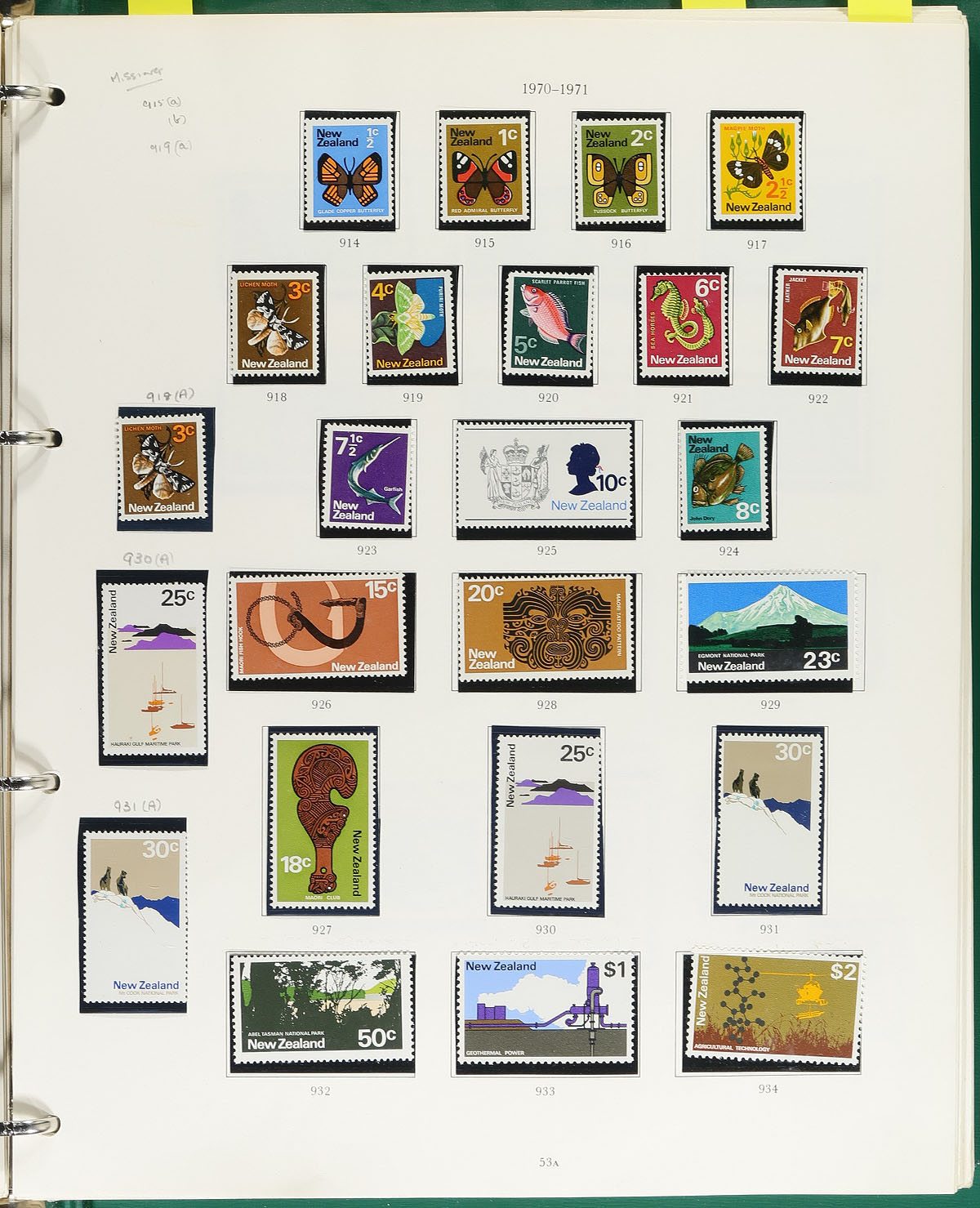 Lovely collection of primarily never hinged New Zealand in a Stanley Gibbons album, 1967-1987, containing roughly 650 stamp, neatly organized in hingeless mounts. The collection ranges from Scott #382/886, along with Health singles and sheets ranging from #B73/B129, along with a few back of the book issues. We estimate the collection to be 90% complete in period, along with a few identified watermark and perforation varieties. We noted some singles, sets, and souvenir sheets cataloguing $10 to $15 and up, with at least a few hundred dollars of face value postage alone. 2025 Scott US$741.00 =