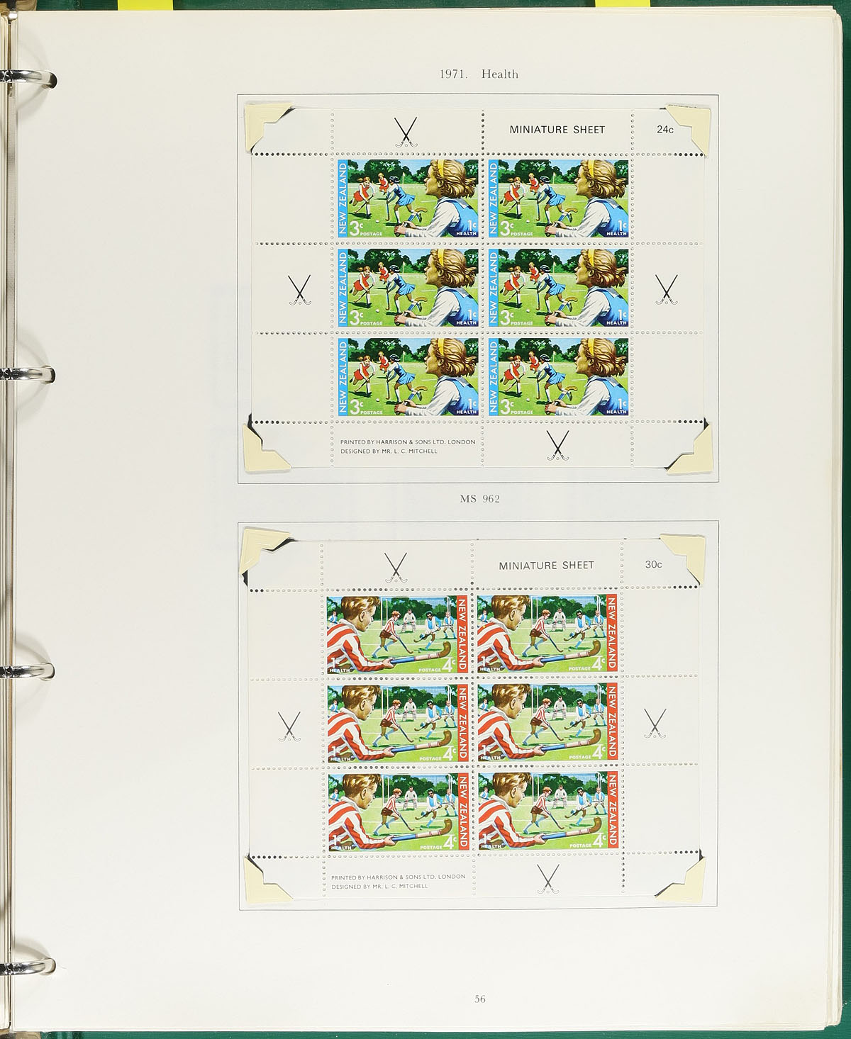 Lovely collection of primarily never hinged New Zealand in a Stanley Gibbons album, 1967-1987, containing roughly 650 stamp, neatly organized in hingeless mounts. The collection ranges from Scott #382/886, along with Health singles and sheets ranging from #B73/B129, along with a few back of the book issues. We estimate the collection to be 90% complete in period, along with a few identified watermark and perforation varieties. We noted some singles, sets, and souvenir sheets cataloguing $10 to $15 and up, with at least a few hundred dollars of face value postage alone. 2025 Scott US$741.00 =