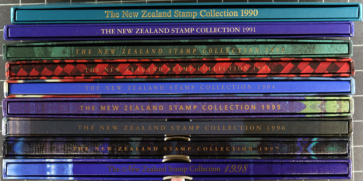Group of 9 New Zealand Annual Collections, 1990-1998, containing never hinged singles, several sets, blocks, souvenir sheets and health stamps. All complete, with at least a few hundred dollars of face value postage. A lovely clean lot for all collectors. 2025 Scott US$752.00 =