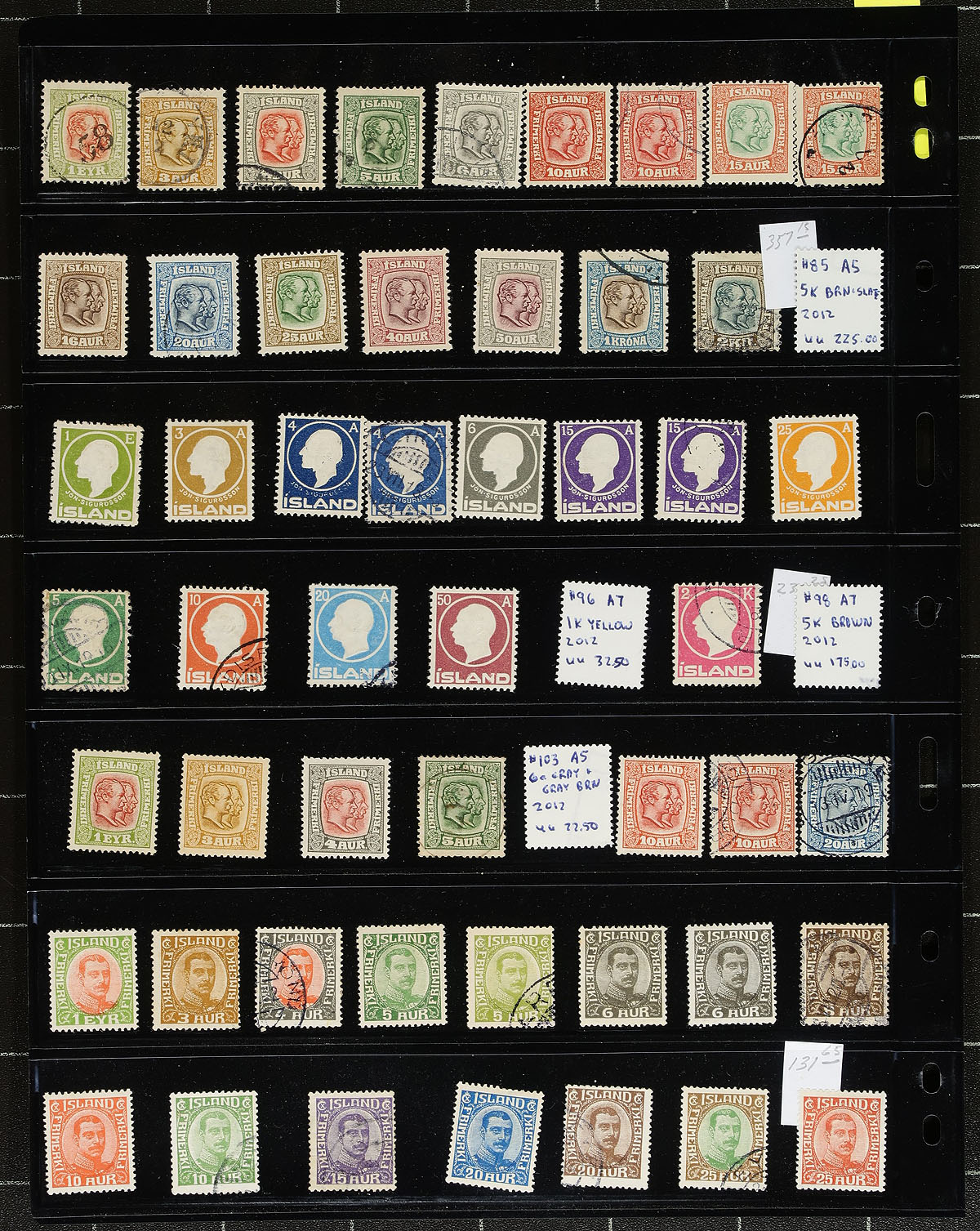 Lovely collection of mint and used Iceland, 1876-2017, containing roughly 1,250 stamps in several Vario stock pages. The collection several mint and used classic issues, along with selections of semi-postals, airmails, officials, souvenir sheets, and a decent selection of modern used issues. We noted several singles, sets, and partial sets cataloguing in the $10 to $35 range and up. Lots of "meat on the bone" here, leaving plenty of value for collectors or dealers looking for stock. Postmark interest includes numerals and bridge cancel types. Some mild duplication throughout with online photos showing a sampling only. A very attractive lot for all collectors and dealers. 2026 Scott US$4,305.00 =
