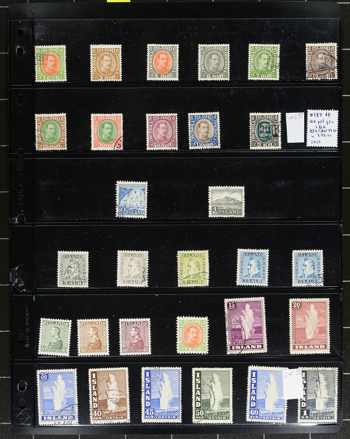 Lovely collection of mint and used Iceland, 1876-2017, containing roughly 1,250 stamps in several Vario stock pages. The collection several mint and used classic issues, along with selections of semi-postals, airmails, officials, souvenir sheets, and a decent selection of modern used issues. We noted several singles, sets, and partial sets cataloguing in the $10 to $35 range and up. Lots of "meat on the bone" here, leaving plenty of value for collectors or dealers looking for stock. Postmark interest includes numerals and bridge cancel types. Some mild duplication throughout with online photos showing a sampling only. A very attractive lot for all collectors and dealers. 2026 Scott US$4,305.00 =