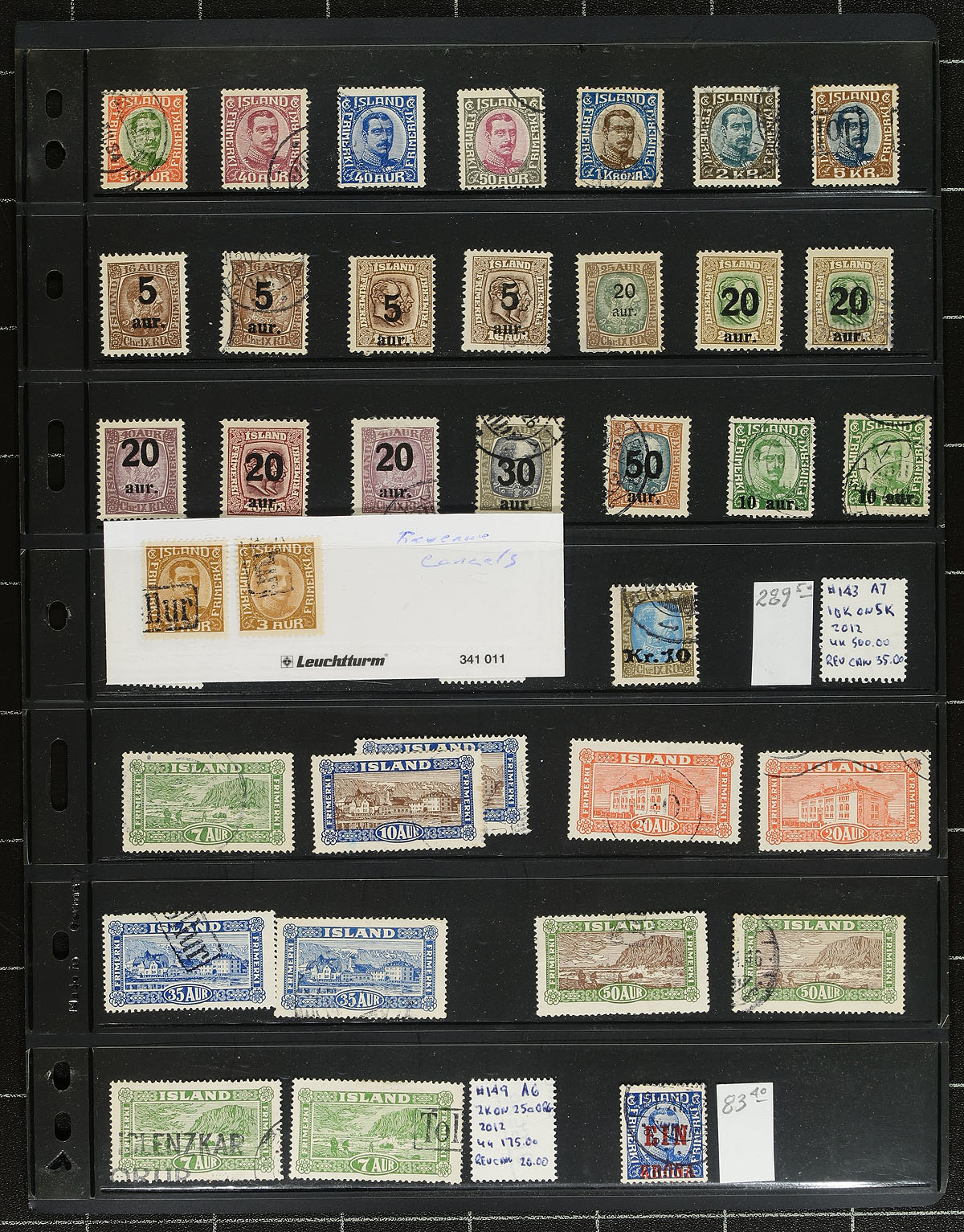 Lovely collection of mint and used Iceland, 1876-2017, containing roughly 1,250 stamps in several Vario stock pages. The collection several mint and used classic issues, along with selections of semi-postals, airmails, officials, souvenir sheets, and a decent selection of modern used issues. We noted several singles, sets, and partial sets cataloguing in the $10 to $35 range and up. Lots of "meat on the bone" here, leaving plenty of value for collectors or dealers looking for stock. Postmark interest includes numerals and bridge cancel types. Some mild duplication throughout with online photos showing a sampling only. A very attractive lot for all collectors and dealers. 2026 Scott US$4,305.00 =