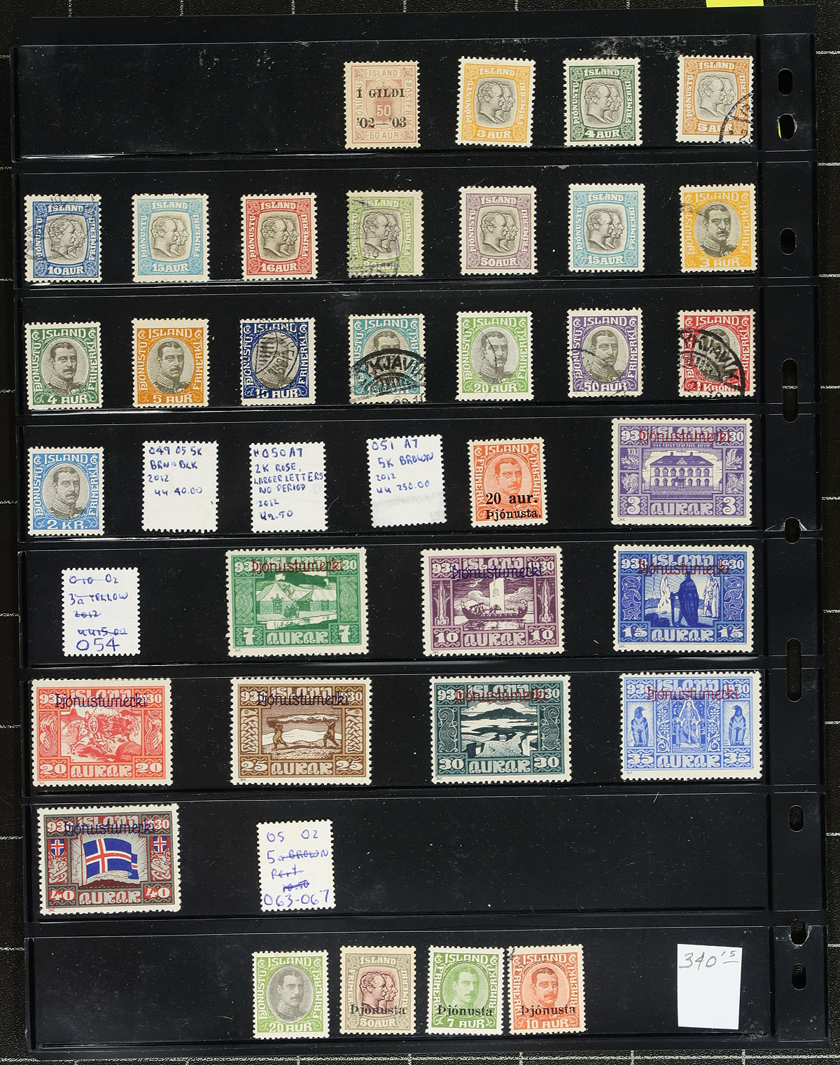 Lovely collection of mint and used Iceland, 1876-2017, containing roughly 1,250 stamps in several Vario stock pages. The collection several mint and used classic issues, along with selections of semi-postals, airmails, officials, souvenir sheets, and a decent selection of modern used issues. We noted several singles, sets, and partial sets cataloguing in the $10 to $35 range and up. Lots of "meat on the bone" here, leaving plenty of value for collectors or dealers looking for stock. Postmark interest includes numerals and bridge cancel types. Some mild duplication throughout with online photos showing a sampling only. A very attractive lot for all collectors and dealers. 2026 Scott US$4,305.00 =