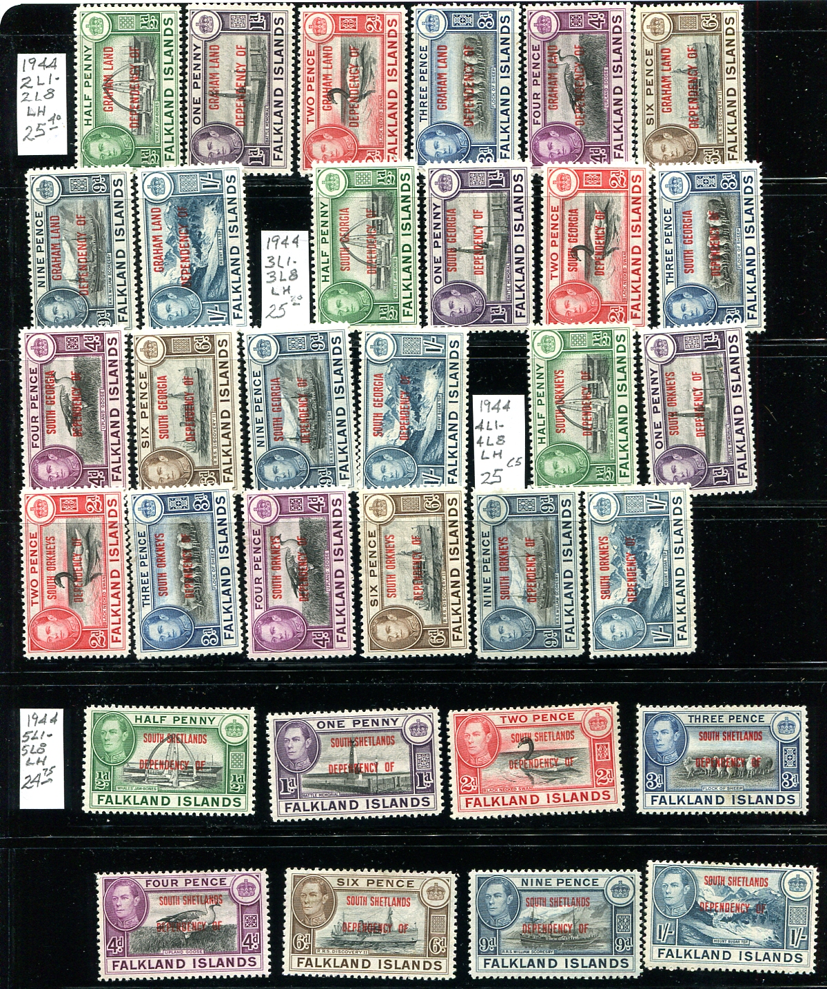 Very nice lot of mint Falkland Islands Dependencies, 1946-1985, containing roughly 150 stamps in a few stock pages. This neatly organized collection ranges from Scott #1L1/1L100, along with a few from separate islands, noting a few singles and sets cataloguing in the $10 to $25 range and up. A nice lot for the Commonwealth collector, with online photos showing all the stamps. 2026 Scott US$463.00 =