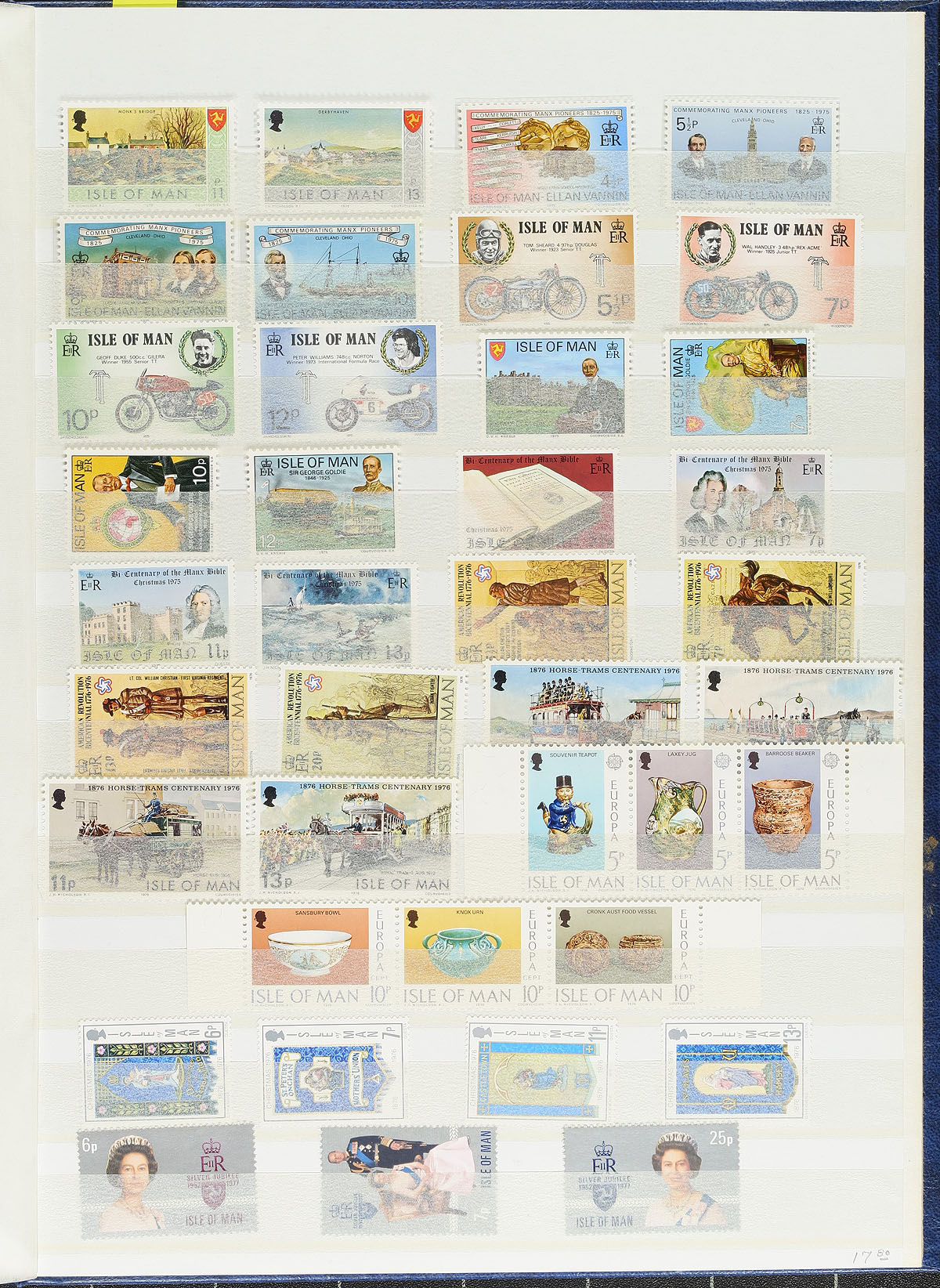 Clean collection of mint never hinged Channel Islands, 1969-1994, containing roughly 1,900 stamps in two stockbooks (one with broken spine noted for accuracy). This well organized collection contains Guernsey (Scott #1/535), Isle of Man (#12/622), Jersey (#26/680), along with souvenir sheets and postage dues, with several sets cataloguing in the $15 to $20 range and up. A nice lot for Commonwealth, topical and thematic collectors as we note several suitable subjects. Clean and very fine. 2026 Scott US$1204.00 =