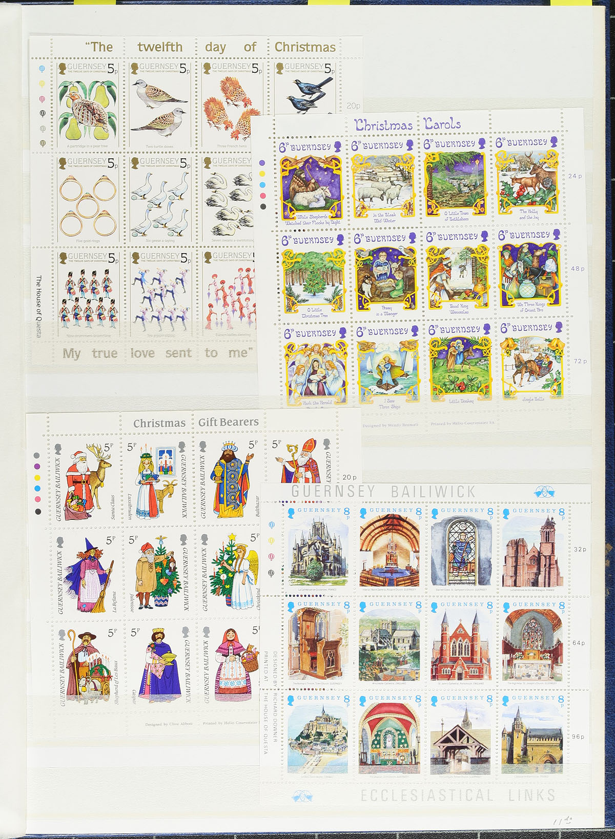 Clean collection of mint never hinged Channel Islands, 1969-1994, containing roughly 1,900 stamps in two stockbooks (one with broken spine noted for accuracy). This well organized collection contains Guernsey (Scott #1/535), Isle of Man (#12/622), Jersey (#26/680), along with souvenir sheets and postage dues, with several sets cataloguing in the $15 to $20 range and up. A nice lot for Commonwealth, topical and thematic collectors as we note several suitable subjects. Clean and very fine. 2026 Scott US$1204.00 =