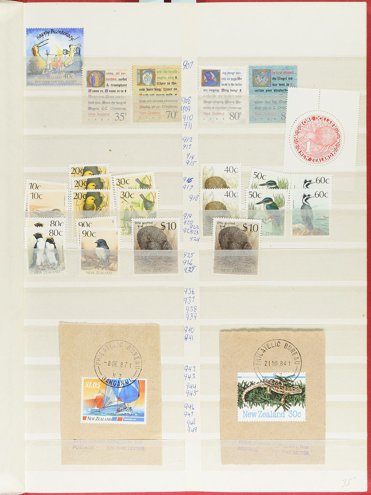 Mostly mint collection of New Zealand, 1882-1999, containing roughly 1,100 stamps housed in 2 stockbooks. This neatly organized collection ranges from Scott #61/1627, including semi-postals, officials, and other "back of the book" items, along with blocks, souvenir sheets and more. We note a few singles, sets, and partial sets cataloguing from $10 to $20 and up, including Scott #s 156, 158-159 (mh, c.v. $91 total). Face value alone would be a few hundred dollars, overall fine to very fine. 2025 Scott US$1,155.00 =