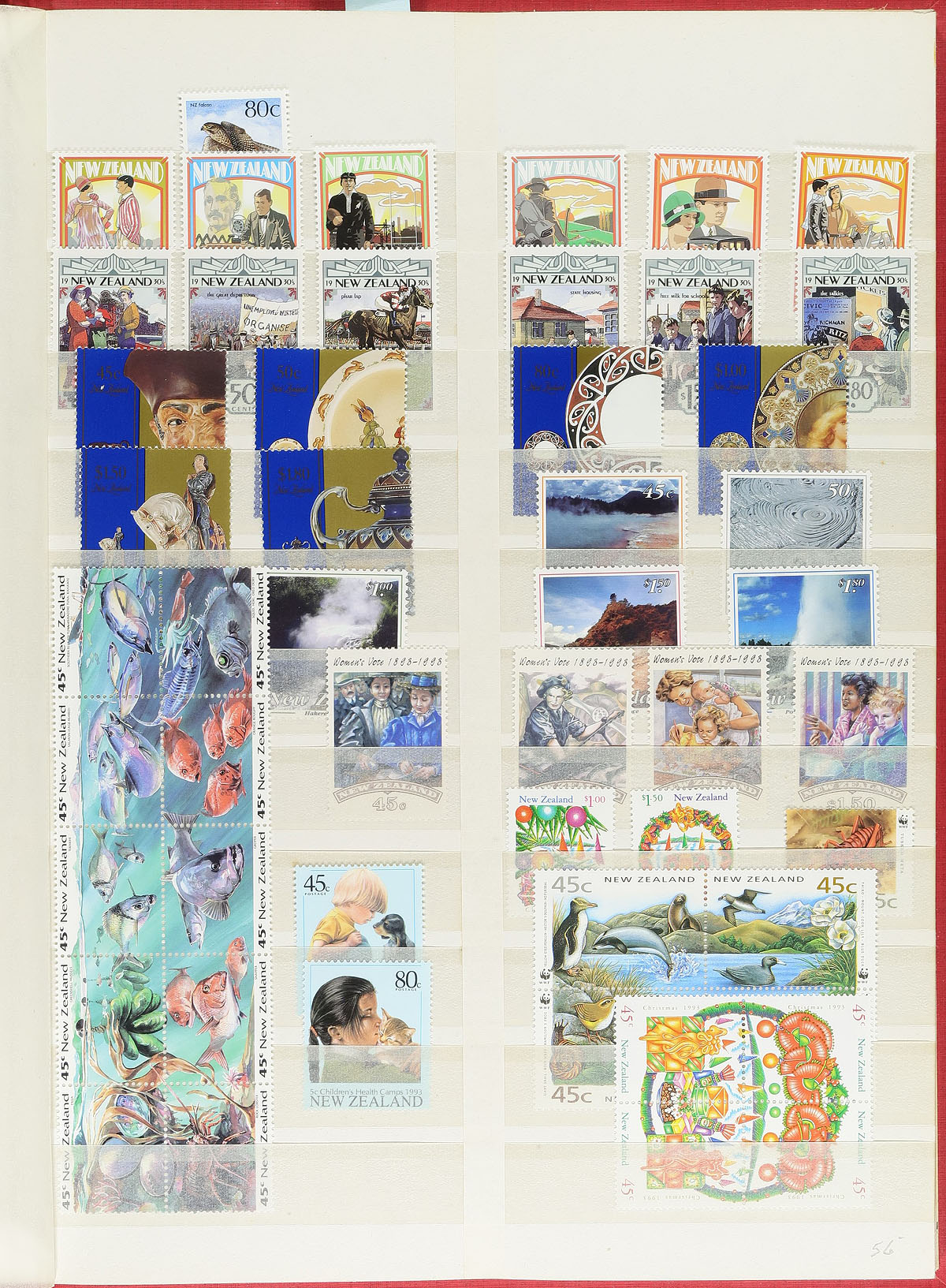 Mostly mint collection of New Zealand, 1882-1999, containing roughly 1,100 stamps housed in 2 stockbooks. This neatly organized collection ranges from Scott #61/1627, including semi-postals, officials, and other "back of the book" items, along with blocks, souvenir sheets and more. We note a few singles, sets, and partial sets cataloguing from $10 to $20 and up, including Scott #s 156, 158-159 (mh, c.v. $91 total). Face value alone would be a few hundred dollars, overall fine to very fine. 2025 Scott US$1,155.00 =