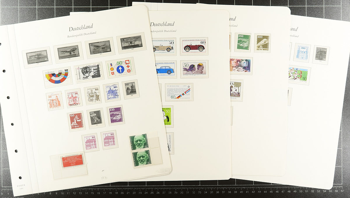 Accumulation of mint Germany, 1950's-2009, containing a few thousand stamps in a variety of formats including a stockbook, over 20 stock pages, and roughly 50 album pages with hingeless mounts. This collection has a bit of everything including Germany, Berlin, and DDR material, noting several sets, souvenir sheets, se-tenants, booklet panes, semi-postal, and more. A spot check indicated some material cataloguing $10 and up, with owner's 2018 Scott catalogue value for the lot totaling US$1,158.00 ($1563.60 CDN), with some duplication throughout. A nice lot for collectors and dealers alike. Estimate =
