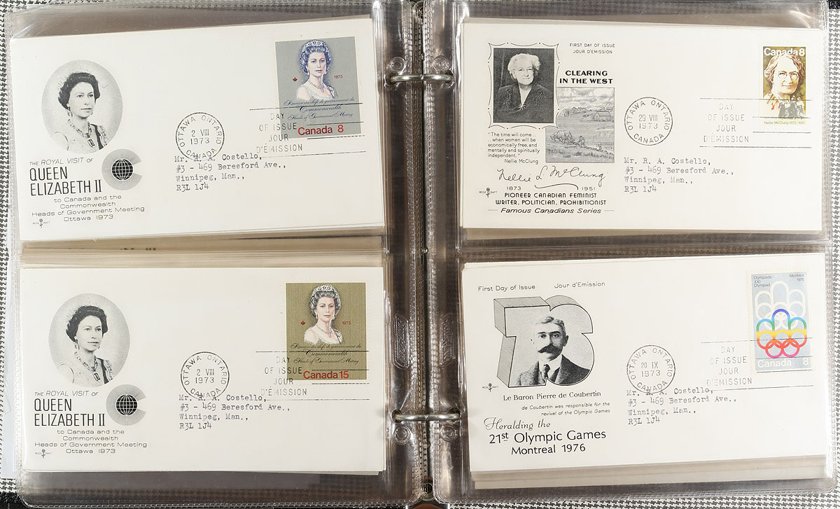 First Day Covers collection / accumulation of roughly 300 Canada private cachet first day covers, in 3 cover albums and loose material in a box. We note single, along with a few pair and block frankings, majority have Rose Craft cachets, but did spot Cole and Capital cachets as well. A nice lot for the dealer or collector. Some mild duplication for some issues, with a few corner bends, overall fine to very fine. Estimate =