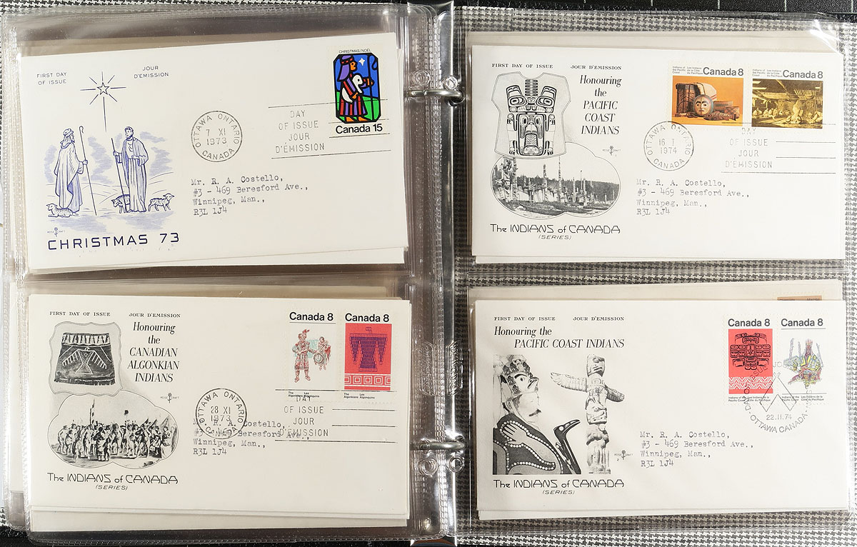First Day Covers collection / accumulation of roughly 300 Canada private cachet first day covers, in 3 cover albums and loose material in a box. We note single, along with a few pair and block frankings, majority have Rose Craft cachets, but did spot Cole and Capital cachets as well. A nice lot for the dealer or collector. Some mild duplication for some issues, with a few corner bends, overall fine to very fine. Estimate =
