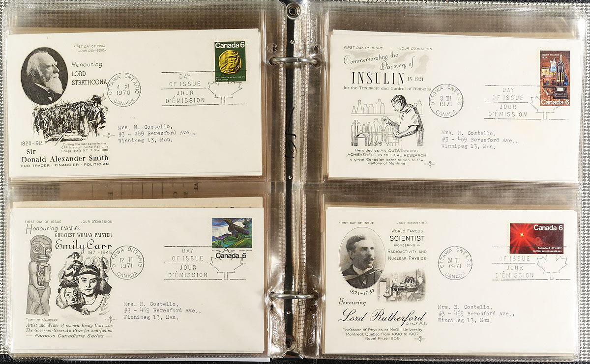 First Day Covers collection / accumulation of roughly 300 Canada private cachet first day covers, in 3 cover albums and loose material in a box. We note single, along with a few pair and block frankings, majority have Rose Craft cachets, but did spot Cole and Capital cachets as well. A nice lot for the dealer or collector. Some mild duplication for some issues, with a few corner bends, overall fine to very fine. Estimate =