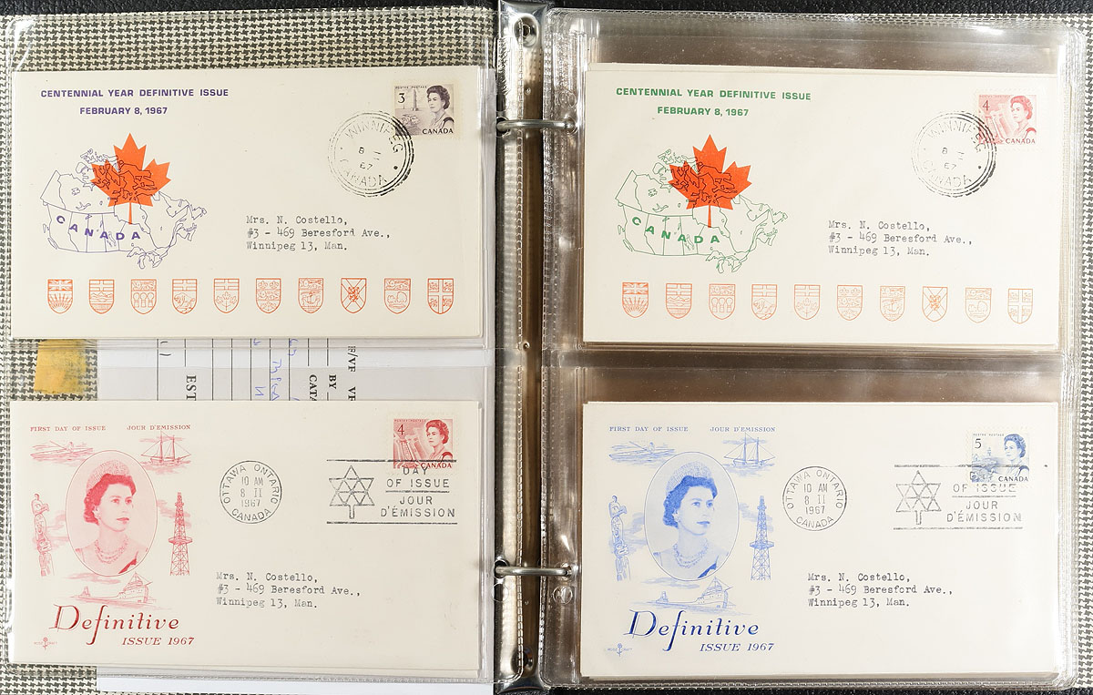 First Day Covers collection / accumulation of roughly 300 Canada private cachet first day covers, in 3 cover albums and loose material in a box. We note single, along with a few pair and block frankings, majority have Rose Craft cachets, but did spot Cole and Capital cachets as well. A nice lot for the dealer or collector. Some mild duplication for some issues, with a few corner bends, overall fine to very fine. Estimate =