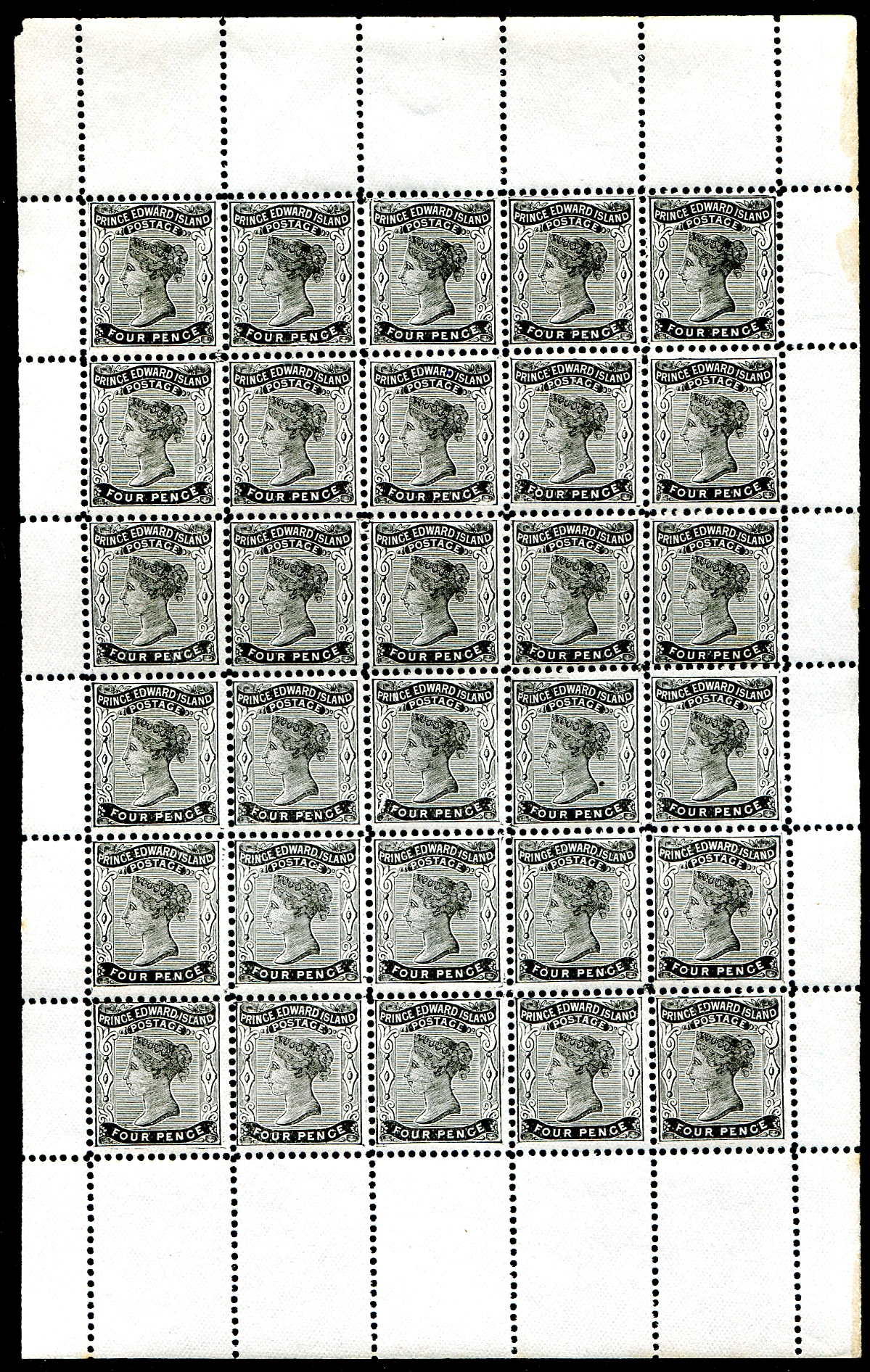 Complete mint Never Hinged full sheet of 30 of the 4-pence black 1868 issue including the "two dot" shading variety (position 7) and the "FOUP" variety (position 19). Post office fresh and F/VF MNH. Excellent positional piece. Catalogued as 30 singles (varieties not mentioned in Scott), but certainly worth more as a sheet. 2025 Scott US$330.00 =